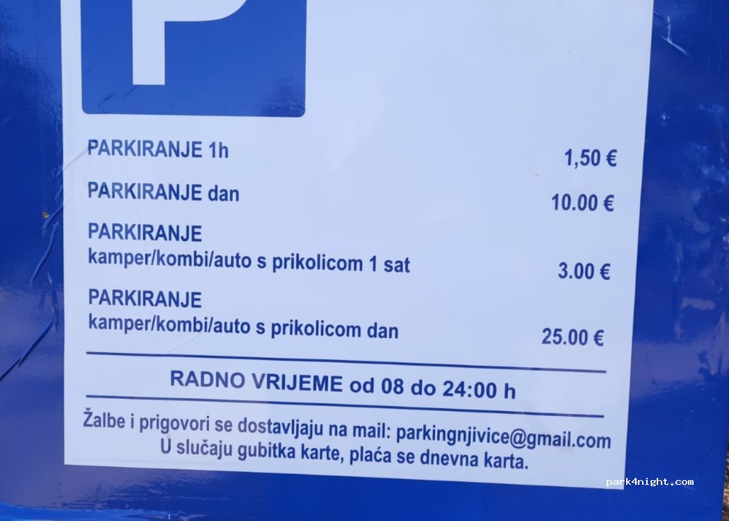 Parking w świetnym miejscu, zaraz obok plaży. brak możliwości uzupełnienia wody czy opróżnienia toalety. zaraz obok na tebtku toalety za 0,50 euro, tak samo prysznice przy plaży. Sklep 200 m i super deptak pełny ludzi do późnych godzin. Na parkingu cicho, czasami może drażnić dzwoń z kościoła obok. Z przyjemnością tam wrócę.