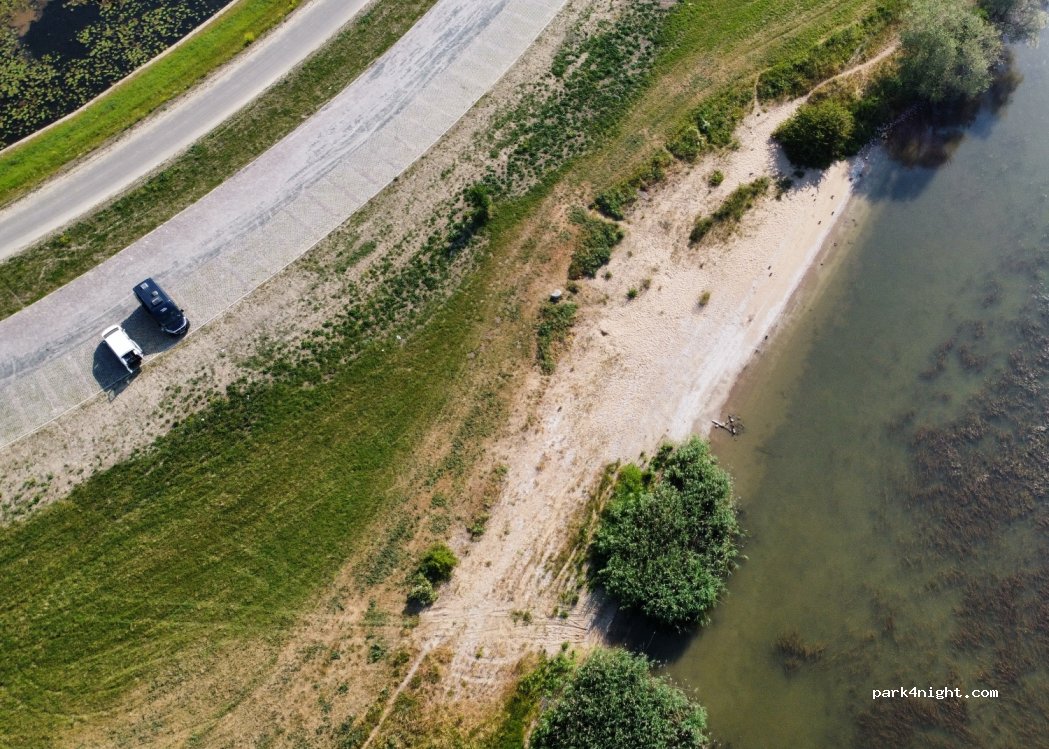 mooie grote parkeerplaats met smalle vakken. aan de rivier en een klein strandje. zwemmen alleen voor sterke zwemmer die weten om te gaan sterke waterstroom richting west.