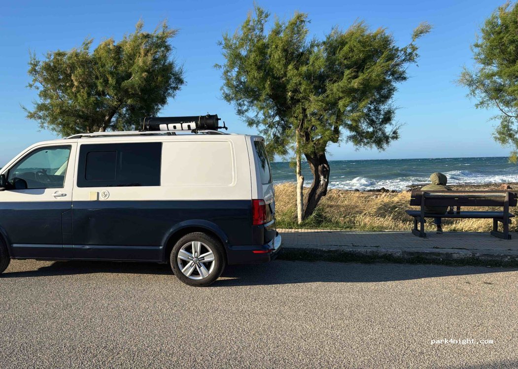 Parcheggio fronte mare, abbiamo passato una notte tranquilla, c'era anche un altro van. C'è un punto di approvvigionamento acqua e doccia disponibile.