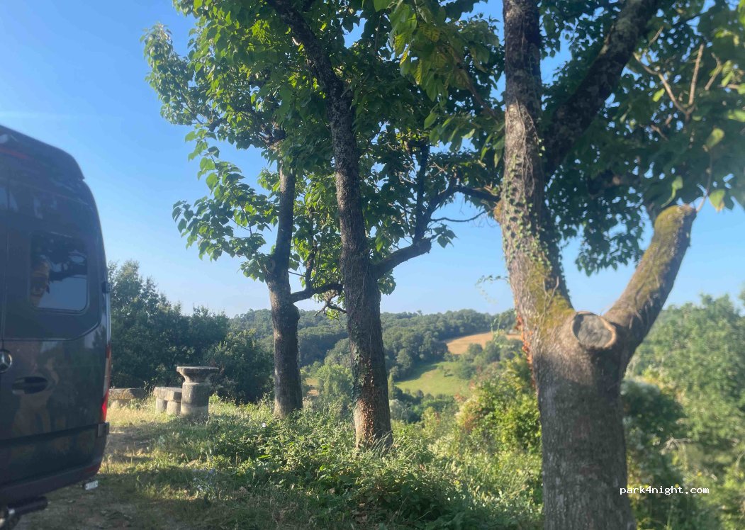 Très bel endroit et point de vue sur la petite vallée et son lac, des bâches et des chevaux sur la colline d’en face. 3 places pour camping car au maximum. Assez proche du bourg pour les commerces mais assez loin pour le bruit, cependant la route reste proche et quelques voitures passent. Une table de picnic et des pierres pour se restaurer à l’ombre.