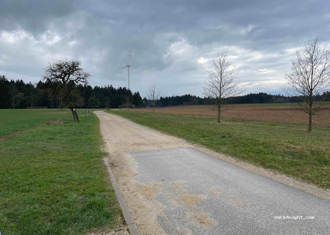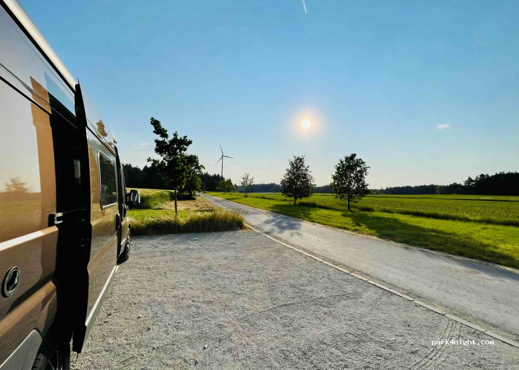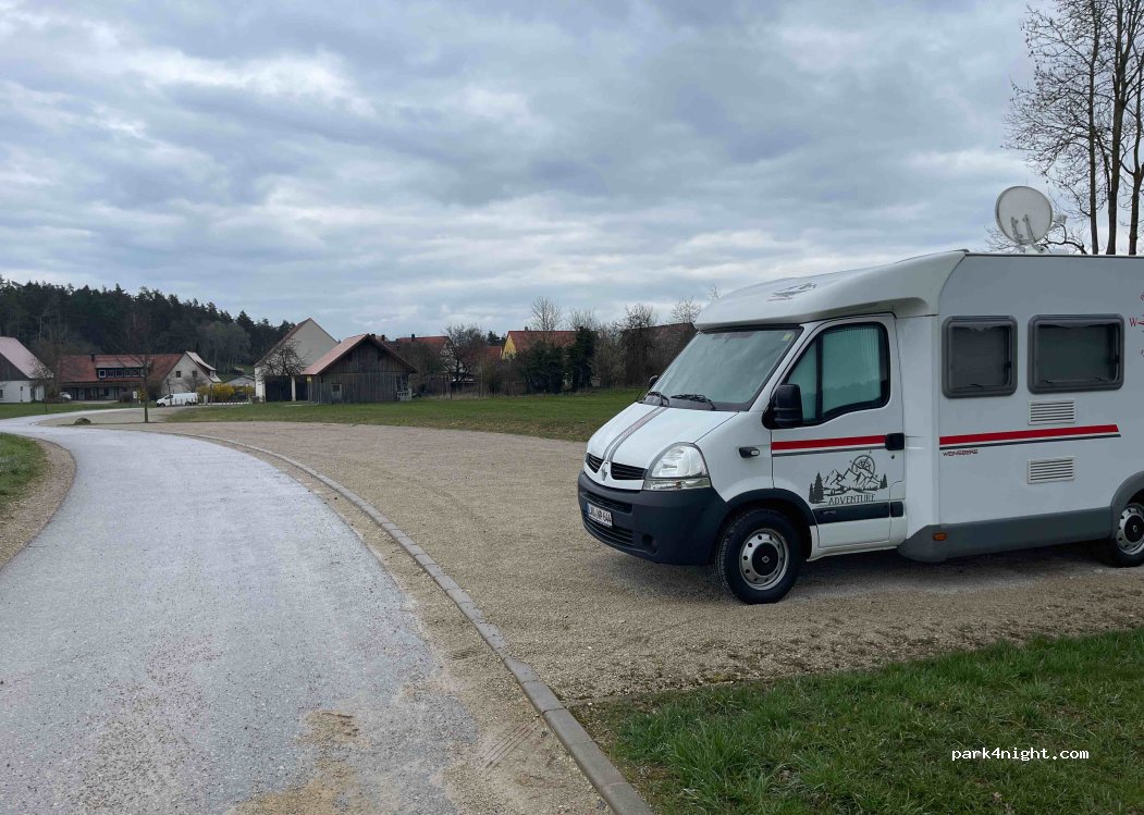 Sehr ruhig gelegen und in mitten von grünen Feldern am Waldrand. Die Stellfläche ist eben und in 2 min Fußweg wartet das Dorfwirtshaus auf einem.