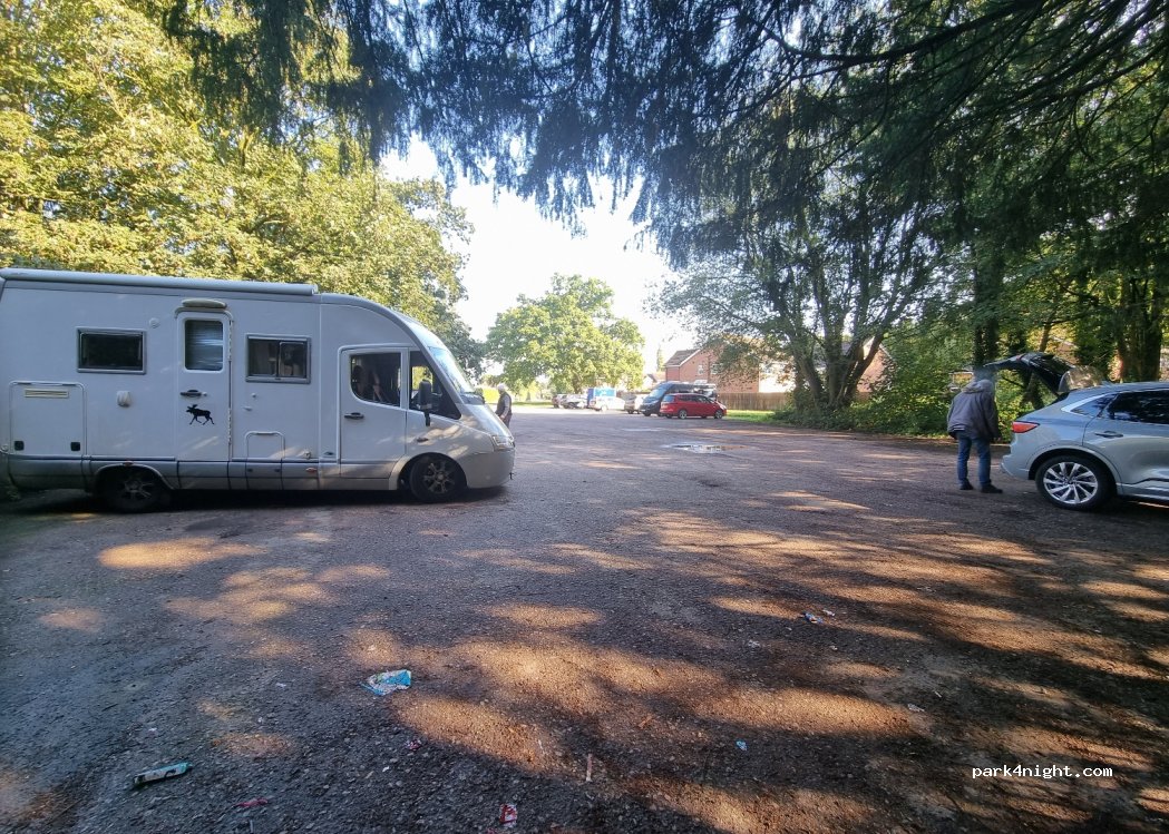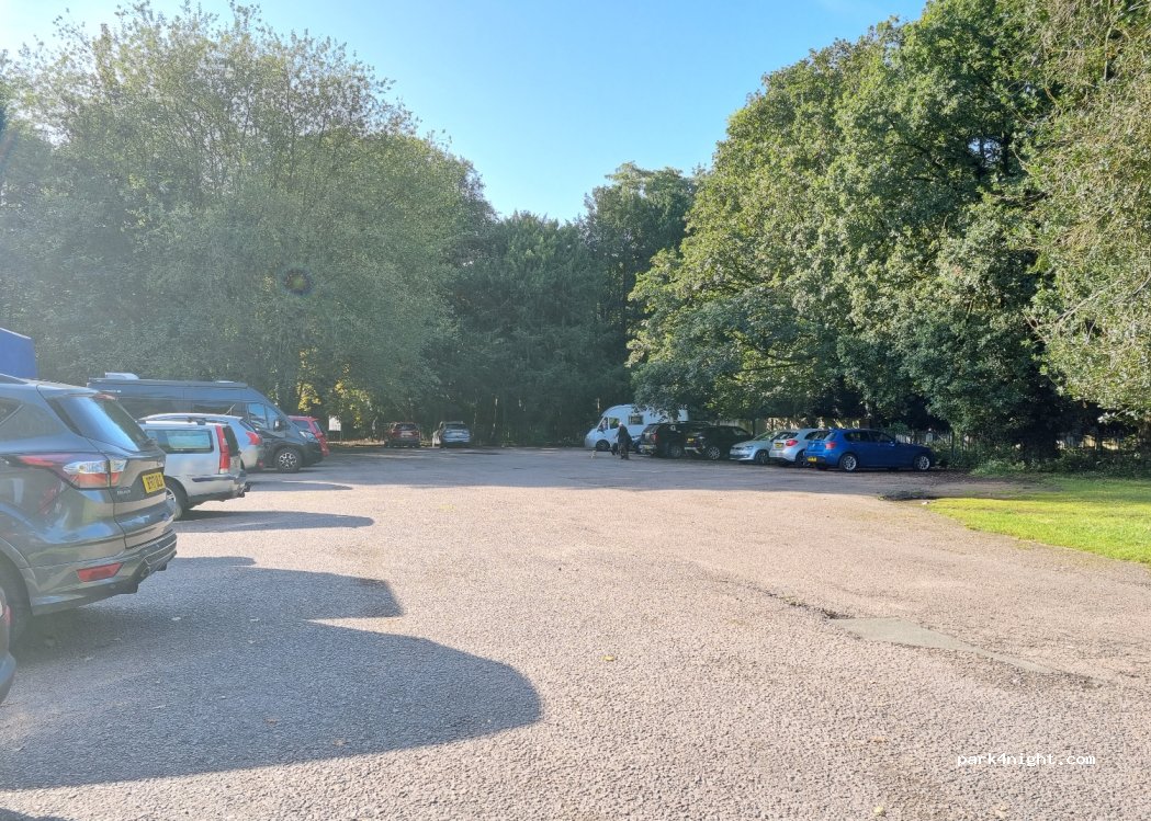 Nice spot, car park small but plenty of space in the evening, no restrictions. Next to large park area with children’s play are, lake walk and zip line, great for dogs. Quiet night and no traffic