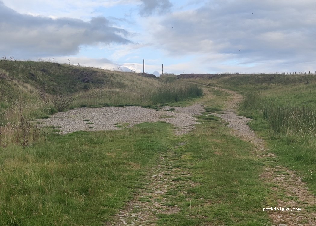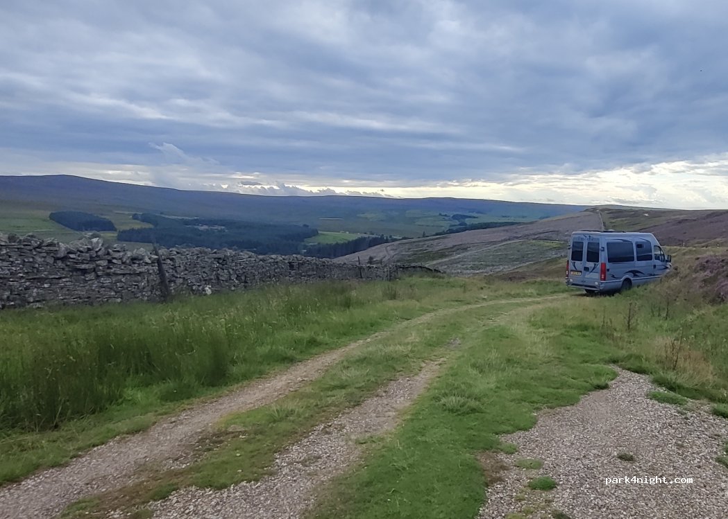 Just off a quiet road and down a little track, which curves off the main road and joins back onto it a few hundred yards down. Could fit a couple vans along it. Great view over the valley and some good walking trails right out the door. Did use 1 ramp to get more level but not really essential. Enough space to sit out with a couple of chairs and let the dog run about on a long line.