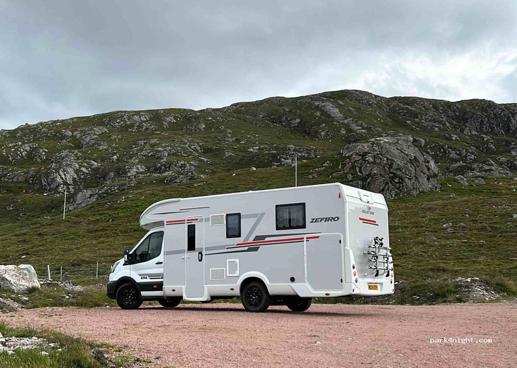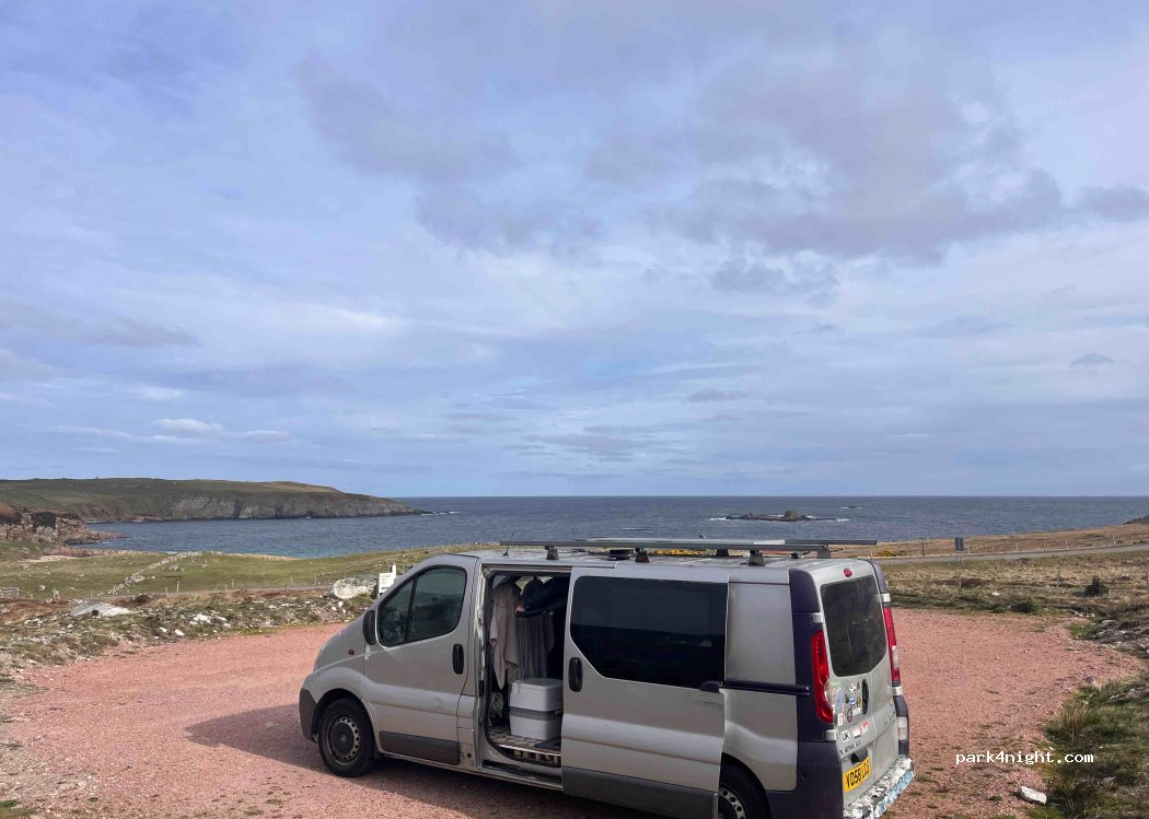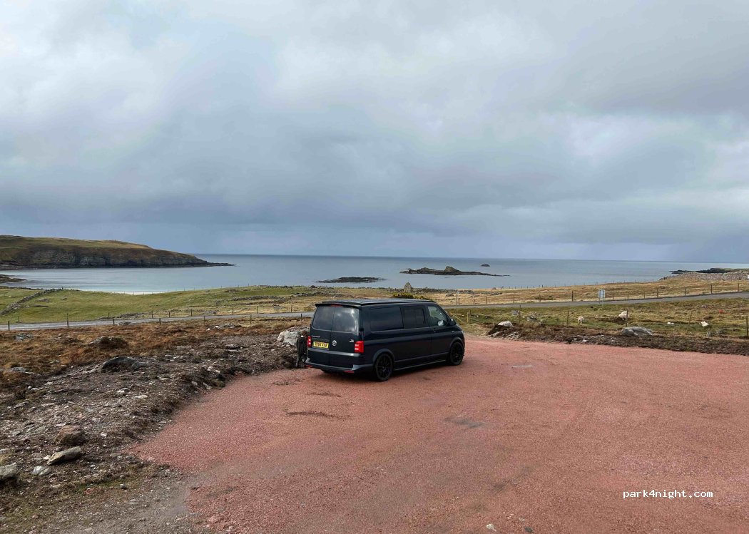 Nice spot for overnight stopover. Just need to pop £10 in the honesty box, nice and flat and enough room for 5 or so campers/motor homes. The road is a little noisy as a cattle grid close by. Lots of midgies!