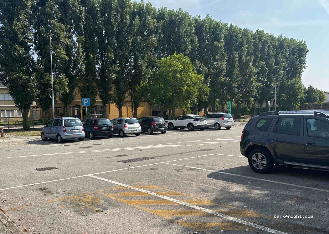 Ubicación tranquila para pasar una noche. Dormimos con las ventanas abiertas y no hubo ningún problema. Le califico de tres estrellas porque cuando llegamos dos de los tres sitios de aparcamiento estaban ocupados por vehículos que no eran ni autocaravanas ni campers. El parking está ubicado al lado de un colegio, supongo que en horario lectivo las mañanas no serán tan tranquilas.