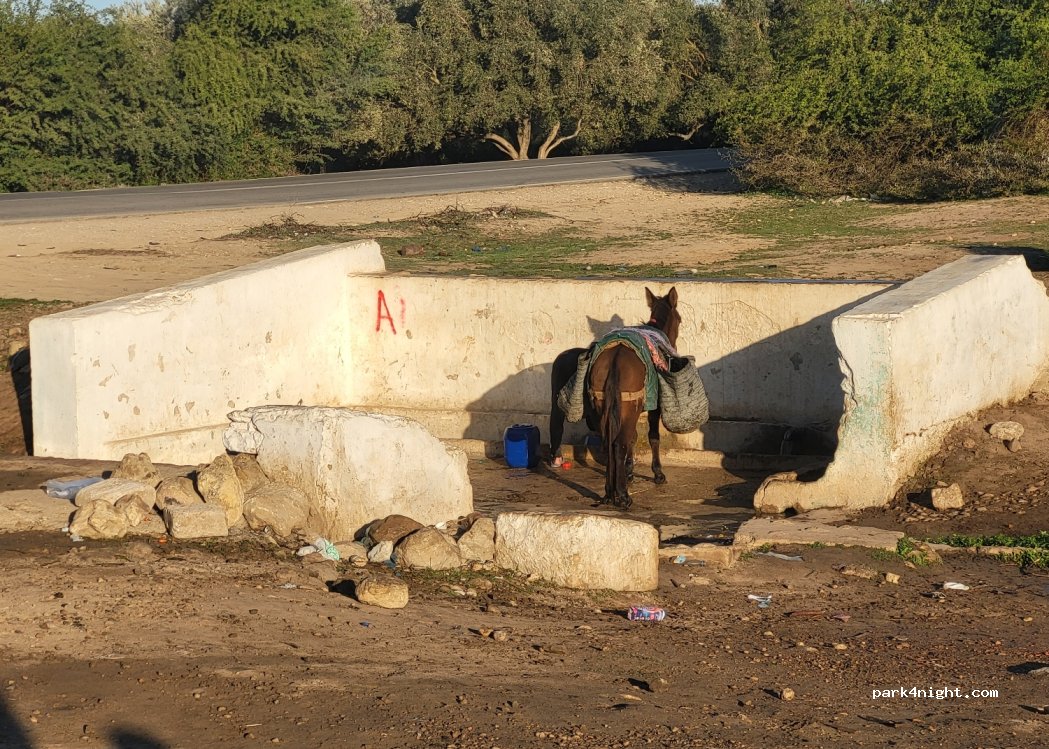 Tranquilo de noche, ruidoso de día por tractores y coches que vienen a por agua a la fuente, bueno para parada, hemos dormido y desayunado muy agusto. Camino de Moulay Idris