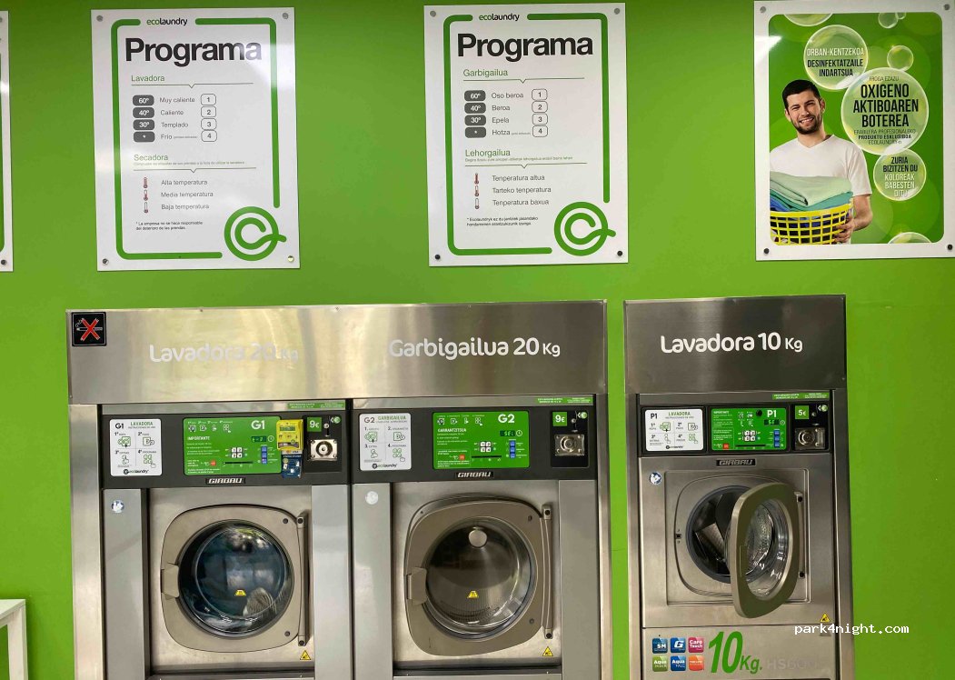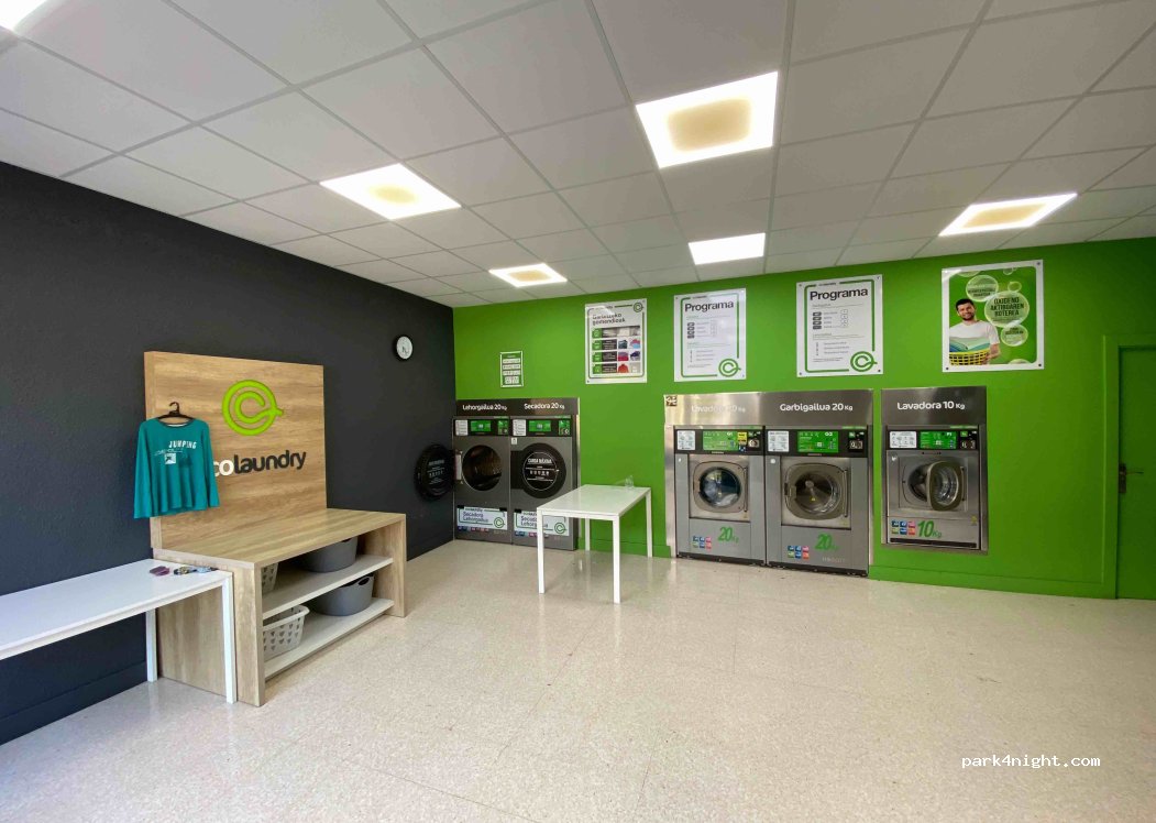 Lavadero pequeño con 2 máquinas de 20 kg, 1 máquina de 10 kg y 2 secadoras de 20 kg. El detergente se puede reservar por 1 euro, al igual que el centrifugado extra. Se puede aparcar al otro lado del río sin problema (900m). Cambio de moneda y máquina con opción de pago Visa/Master.