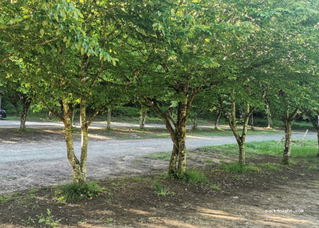 Parking du château de Commarque. Plat sur herbe. Proche de la forêt. Les toilettes accessibles aux heures d'ouverture du château. Lieu très agréable