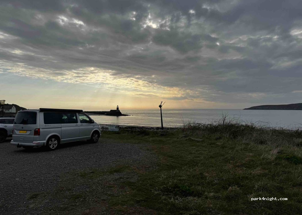 Wow beautiful views what a find. Lighthouse on small harbour. Sandy beach for dog walks. Off grid campervans. Picnic bench. No facilities so leave nothing behind. Be responsible and respectful of the locals who live here. Remote but easy for small to medium campervans by google. Peacefull sleep. 02 connection good. Sandy beach, good for dog walks. Will be back