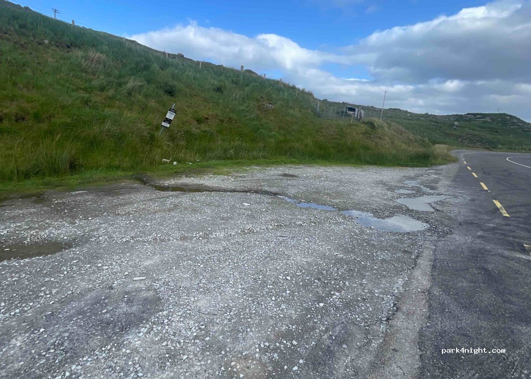 Vue superbe sur le lac Barfinnihy. Parking le long une route peu passante. Lieu de montagne isolé. Super pour une nuit tranquille, légèrement en pente.