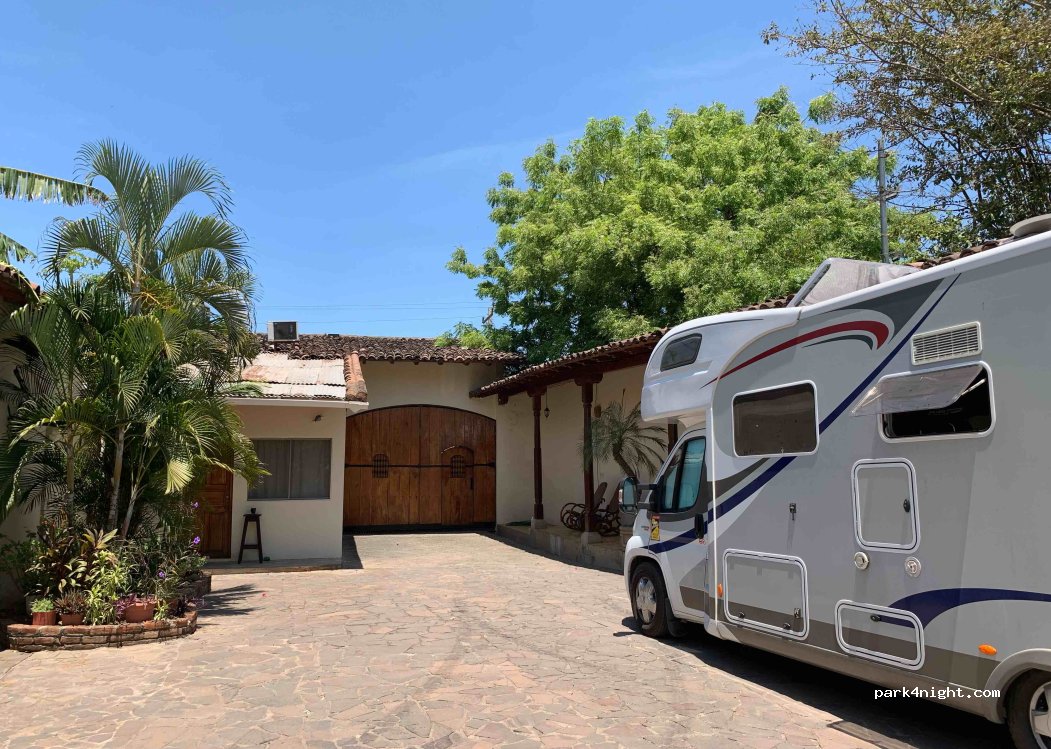 RV Park and camping dans une grande cour pavée fermée et à l’abris de tous regards. Accès à des équipements de cuisine à des tables et fauteuils à l’ombre. Très agréable.