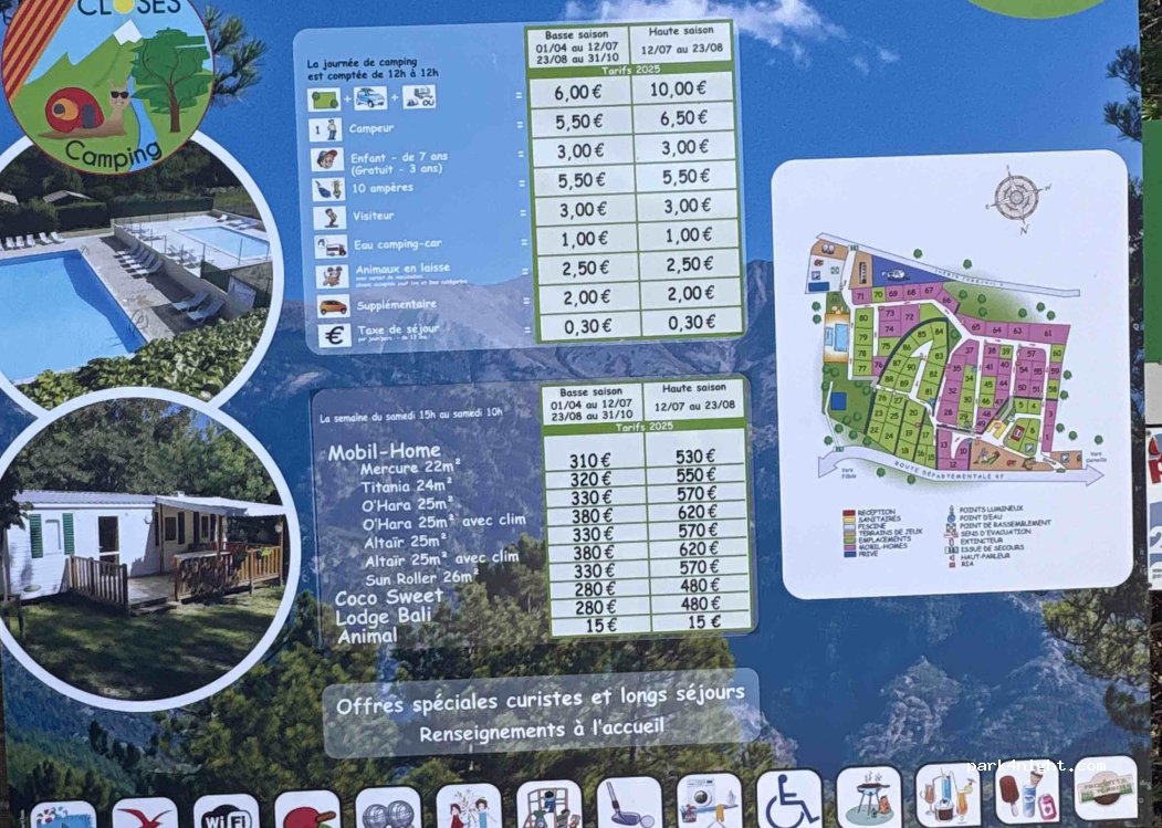 Motorhome area rate: €8 per night for 2 people without services (drainage possible)