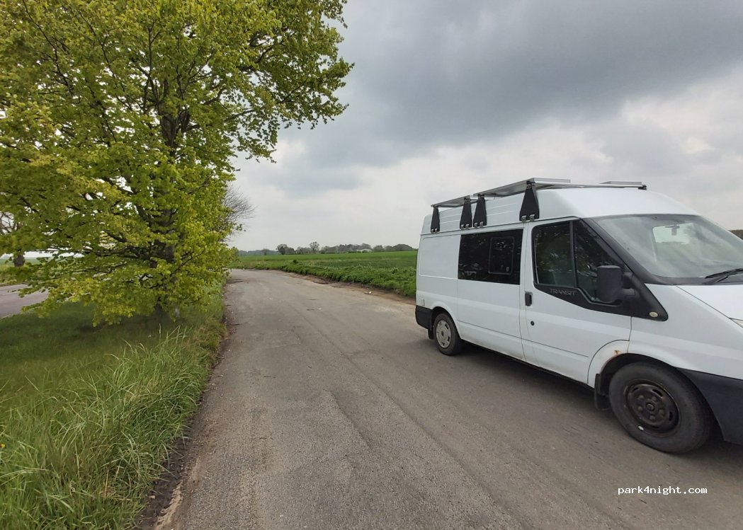 Just an off set lay-by off the road with a couple of trees for privacy. no signs saying no camping etc. its a place to park up for the night at a pinch with nice views over fields.