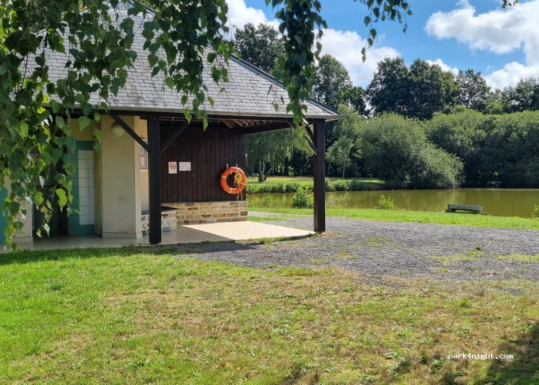 Endroit idéal, calme au bord d’un étang. Sanitaire propre à disposition avec urinoir, wc avec papier toilette, évier avec eau. Barbecue, poubelles, terrain de boule, table de pique-nique, jeux pour enfants et étang pour la pêche sur place. Nous avons passé une nuit agréable et tranquille. Des pêcheurs sont arrivés tôt le matin mais sans aucunes nuisances. Merci de préserver ce lieu idyllique.