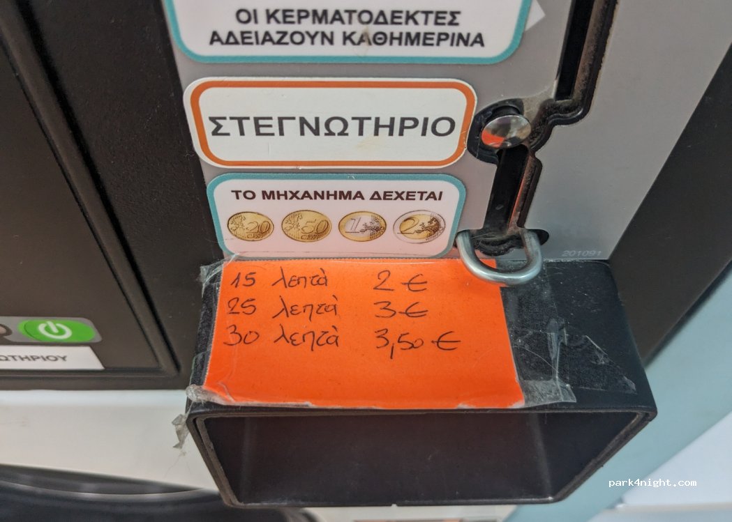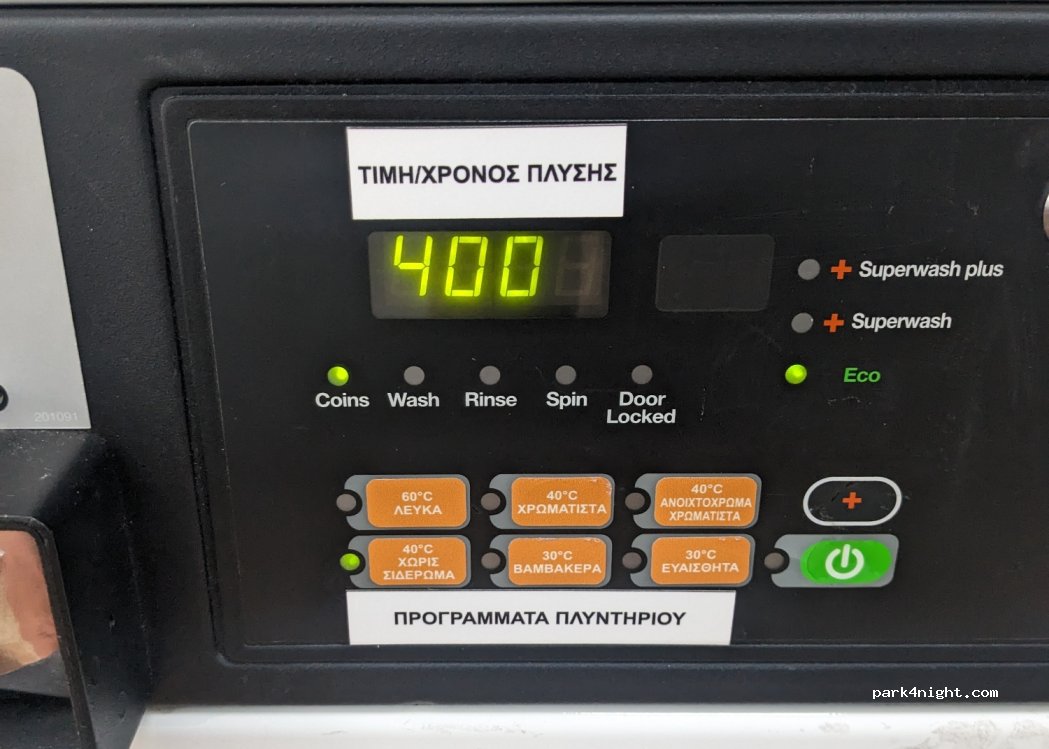 Washing machine 4€ normal load. 16 kg washing machine 7,50€ Dryer 15 min 2€ 25min 3€ 30min 3,50€ Everything works really well and there is internet. Park at the stadium as there is no easy parking in front.