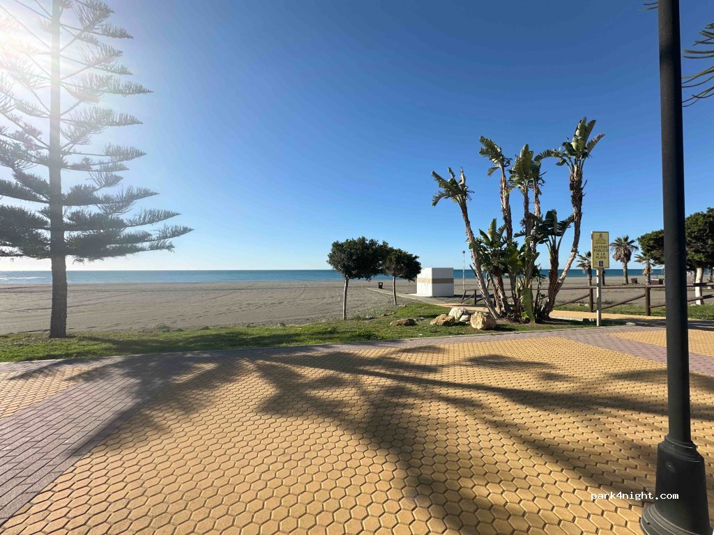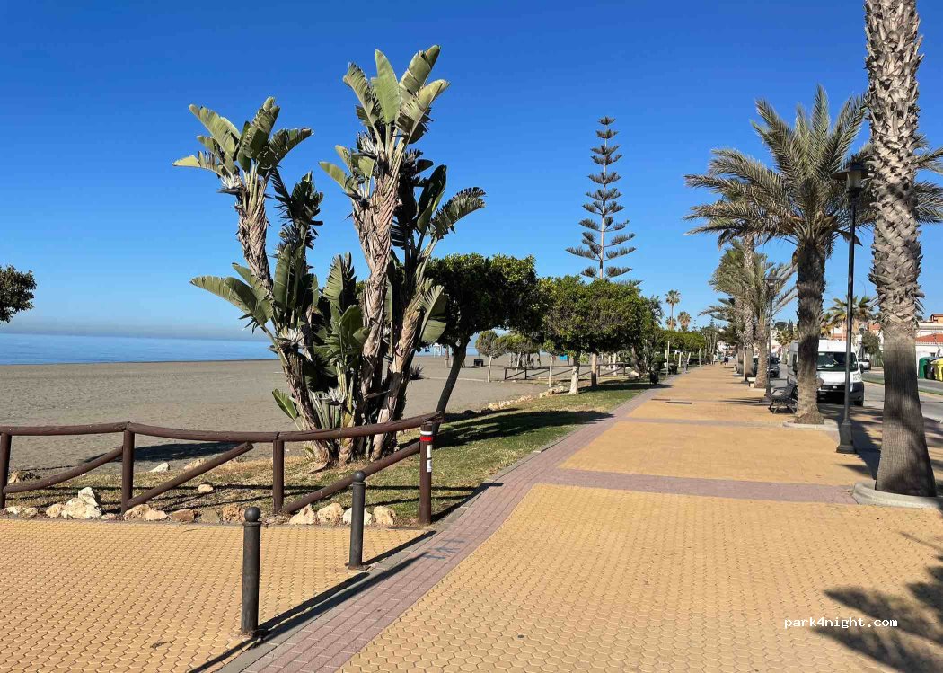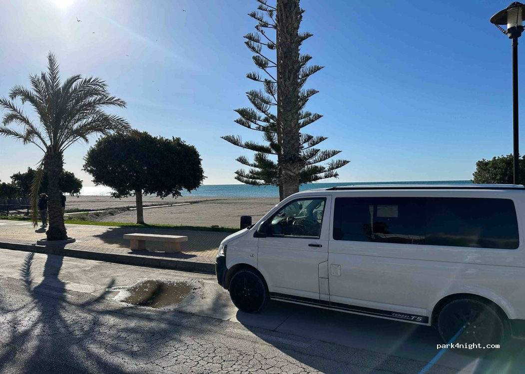 Parkplatz am Strassenrand. Direkt an der Strandpromenade. Grosser Strand und Restaurants, kl. Supermarkt in Umgebung. Strasse ist auch nachts gut befahren. Perfekt für Tagsüber am Strand. In der Nebensaison kein Problem dort ein Parkplatz zu finden ( abends)
