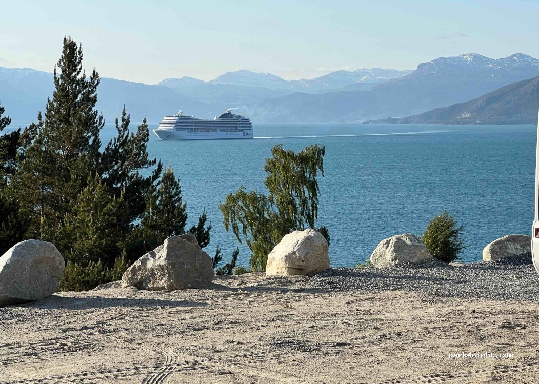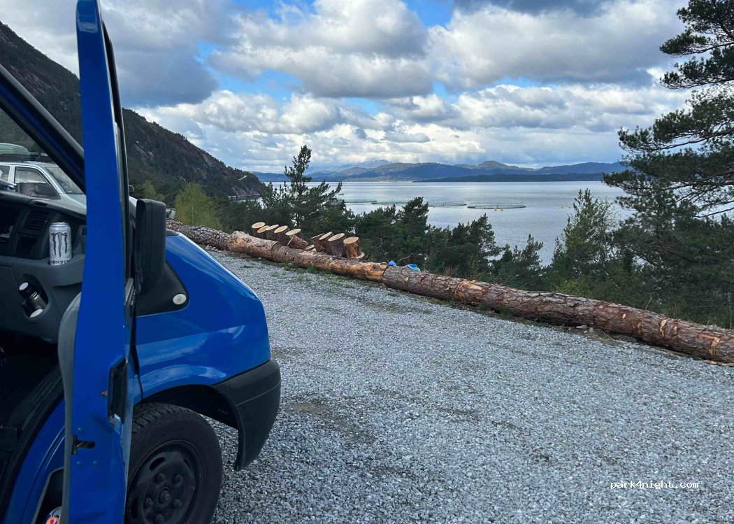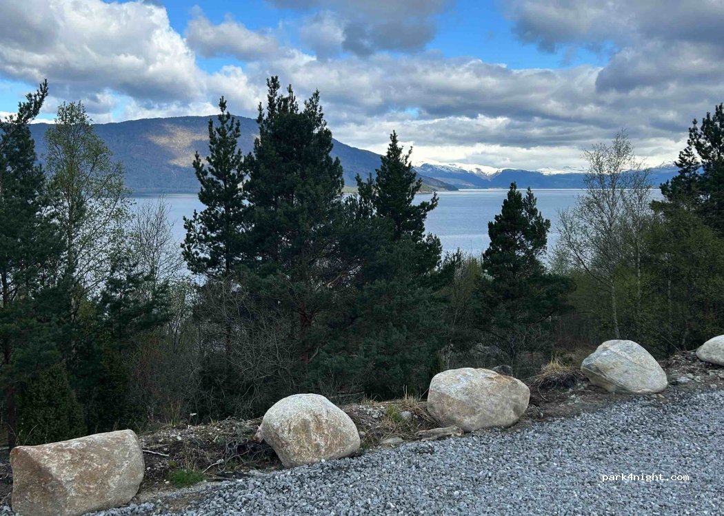 Parking sur gravier, avec vue sur le fjord. Très bien pour une nuit. Attention sa appartient au camping à 500m plus loin,suivant l heure vous payé au camping avant 17h. Après en soirée le propriétaire passe ou le matin très tôt. Vraiment très bien.