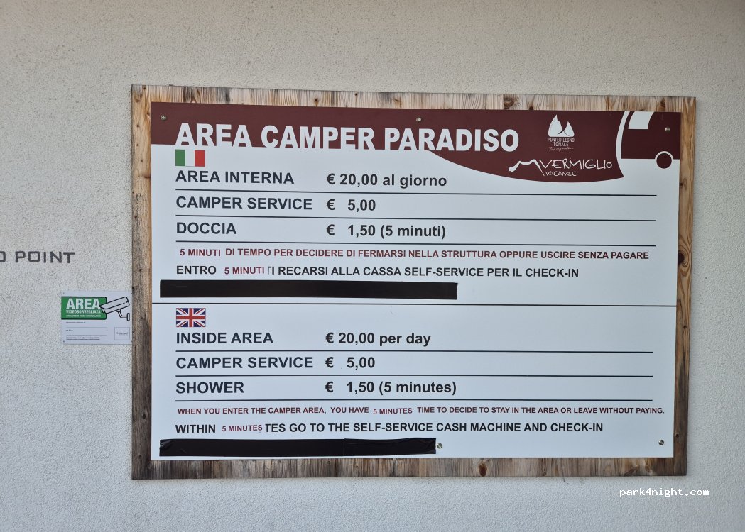 L'area recintata del primo parcheggio dispone di 26 posti ed è riservata ai camper, con stazione di rifornimento e smaltimento oltre a energia elettrica per ogni posto, servizi igienici con wc e docce con acqua calda. I servizi sono tutti compresi nel prezzo giornaliero, ad eccezione delle docce. Per Camper Service: Ritirare la keyCard al totem d’ingresso, una volta entrati recarsi alla reception inserire la KeyCard pagare l’importo dovuto per validare la keyCard che servirà per aprire la zona CS ( inizialmente 10€ - 5€ cauzione) ad operazioni finite recarsi di nuovo alla reception inserire inserire nuovamente la KeyCard e richiedere la restituzione della cauzione verrà restituita insieme alla KeyCard da inserire al totem d’uscita.