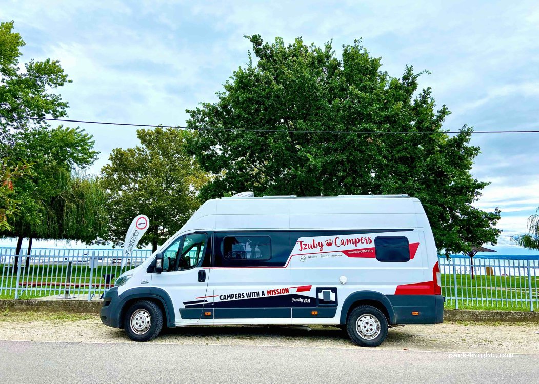 Das mag ein Platz sein, der in der Nebensaison zu empfehlen ist. Ende Juli ist es voll, alle Parkplätze belegt, die hier gezeigten sind mitten im Trubel zwischen zwei Essensbuden und gegenüber eines Kinderspielplatzes. Es gibt keine Bäume, die etwas Schatten spenden, um überhaupt im Van schlafen zu können. Es gibt deutlich schönere und ruhigere Plätze am Balaton, z.B. den in Balatonfenyves.