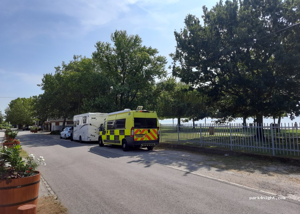 Abbiamo passato una notte assieme ad altri tre camper, zona super tranquilla, nel posto più vicino al bar ad un certo punto della notte è partita L irrigazione automatica e sembrava che piovesse :) ovviamente è bassa stagione quindi è tutto chiuso, per fare colazione e mangiare ci siamo sposati nella città subito dopo che è più grande.