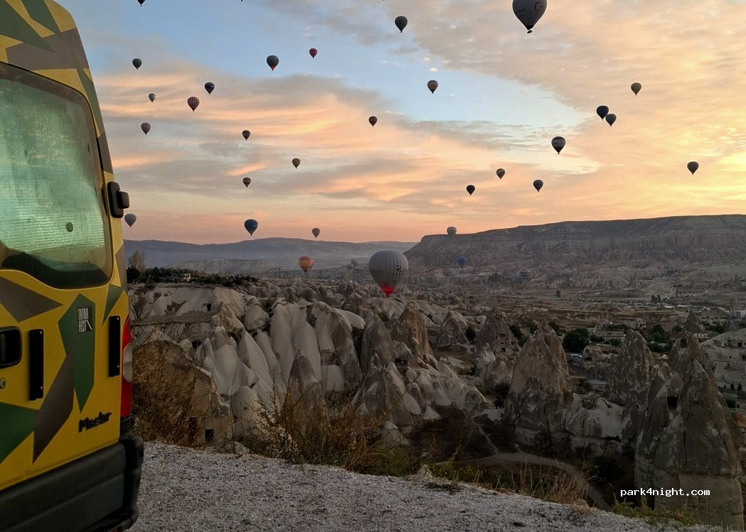 I parked at the view point few meters north. The view is great and in the morning balloons fly right above your head and also below you in the valley. During the day the viewpoint was very busy with busses and individual tourists. Nights very quiet.