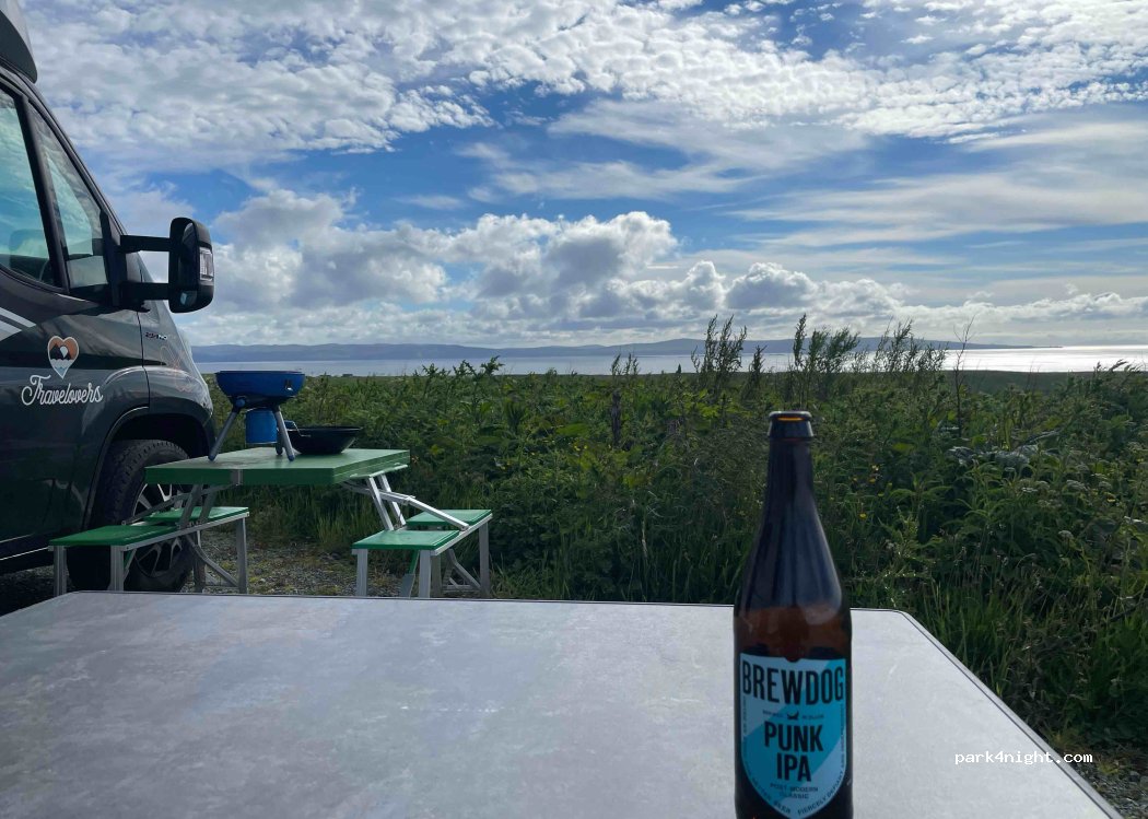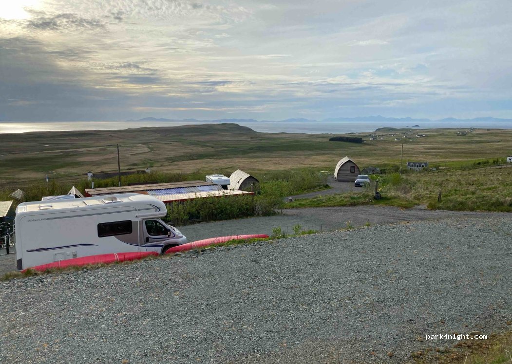 Nous y avons passé une nuit, la vue sur les Hébrides Extérieures est sensationnelle ! Quelques midges que la fumée du barbecue a vite fait fuir. Nuit très calme malgré l'éolienne à proximité. Arrivée tardive, nous avons passé un petit coup de fil plus tôt dans la journée pour savoir si c'était OK et avons eu un accueil très sympathique. Bloc sanitaire non testé. Paiement en espèces uniquement.