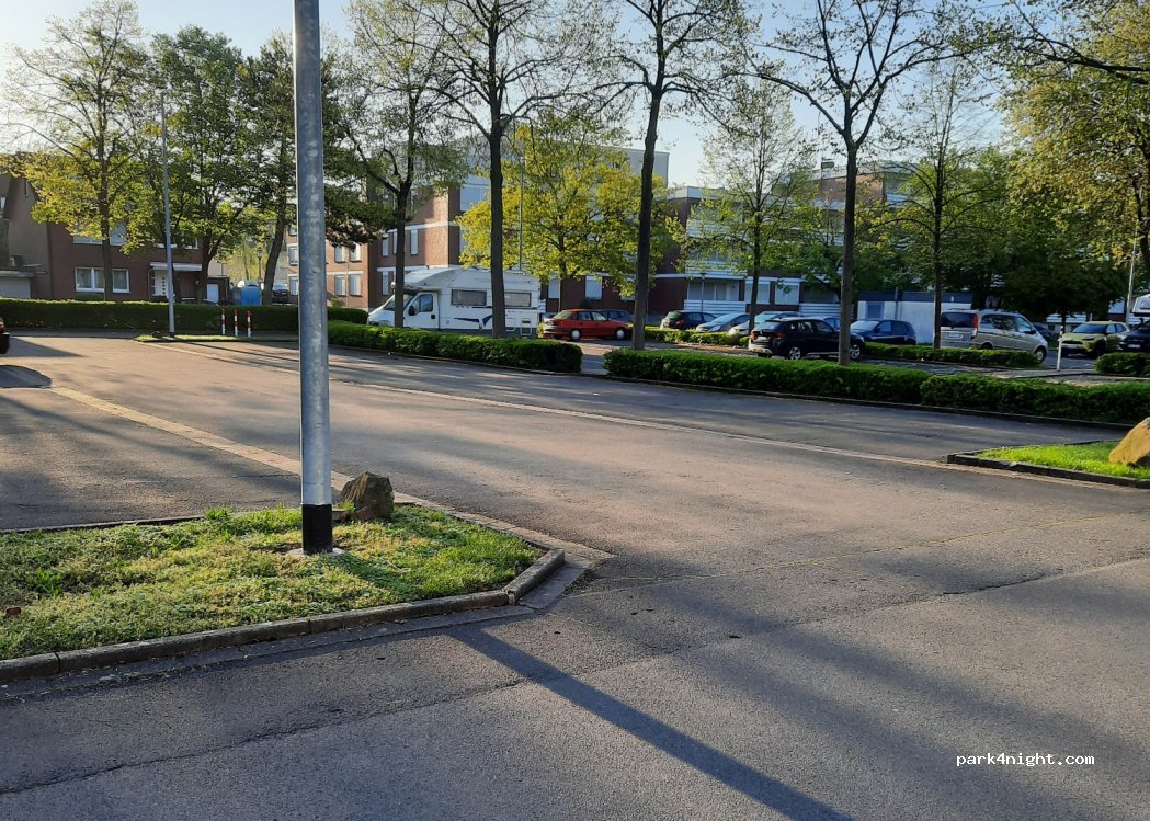 Le grand parking pavé de la Sachsenhalle. Situé au calme dans un quartier résidentiel. Un marché Lidl et une station-service, ainsi qu'un snack-bar turc se trouvent à proximité.