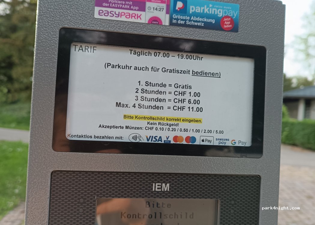 Arrivé 23h, réveillé a 6h20 par la police de Zurich. Il est interdit de stationner ici la nuit. Je cite " pas de panneaux, c'est que c'est interdit"
