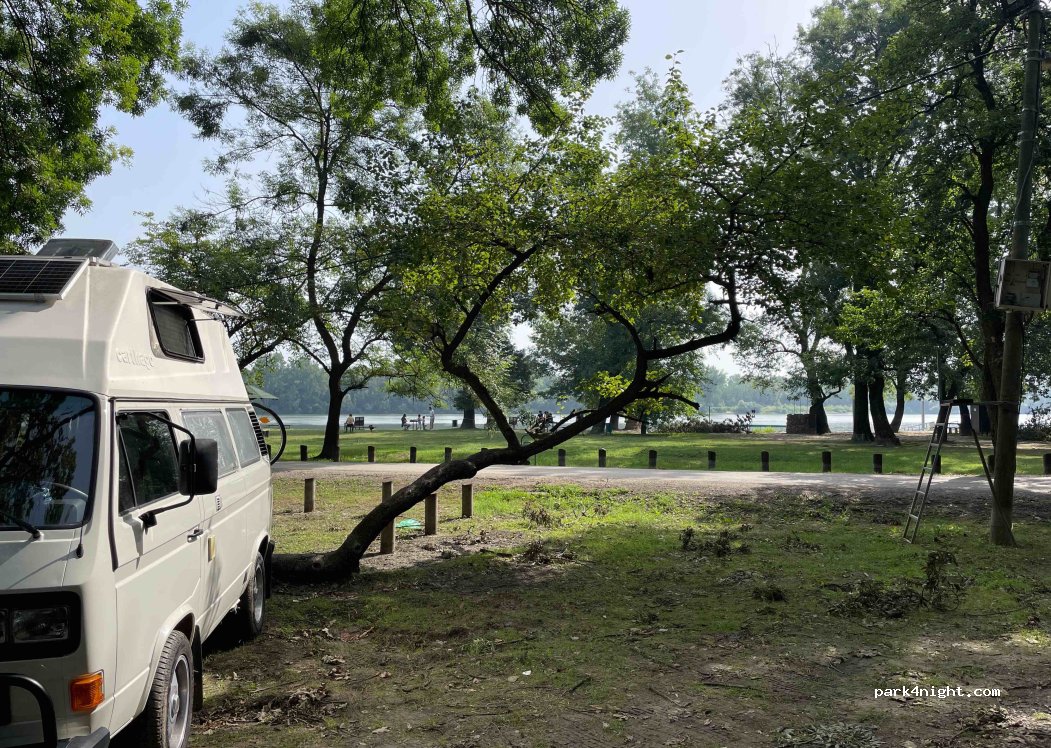 Big local picnic area near the river Sava. Possible places to park around and near restaurant. There are outdoor showers and water taps, maybe possible to bring camper near to fill up but better is a tap down the road before. Lots of lounge places to chill. Locals come often till late to chill and drink so can be noisy but noone bothered me. There are some cycle paths and walks around the area, also playground for kids.