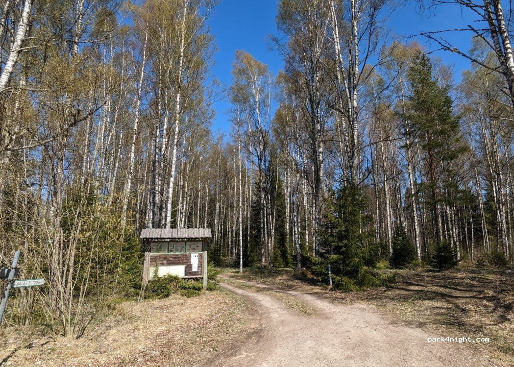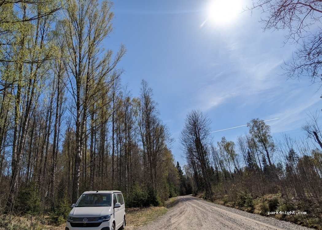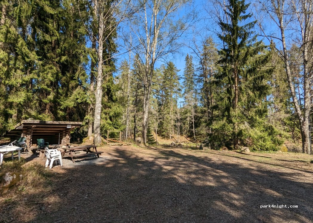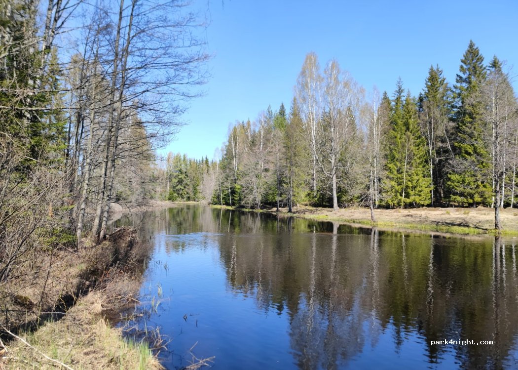 Parking space lost in the middle of nowhere in the forest, next to a river where you can fish (fishing license to buy). There are dry toilets, a shelter and a place to make a fire. Several picnic tables too. Very pleasant