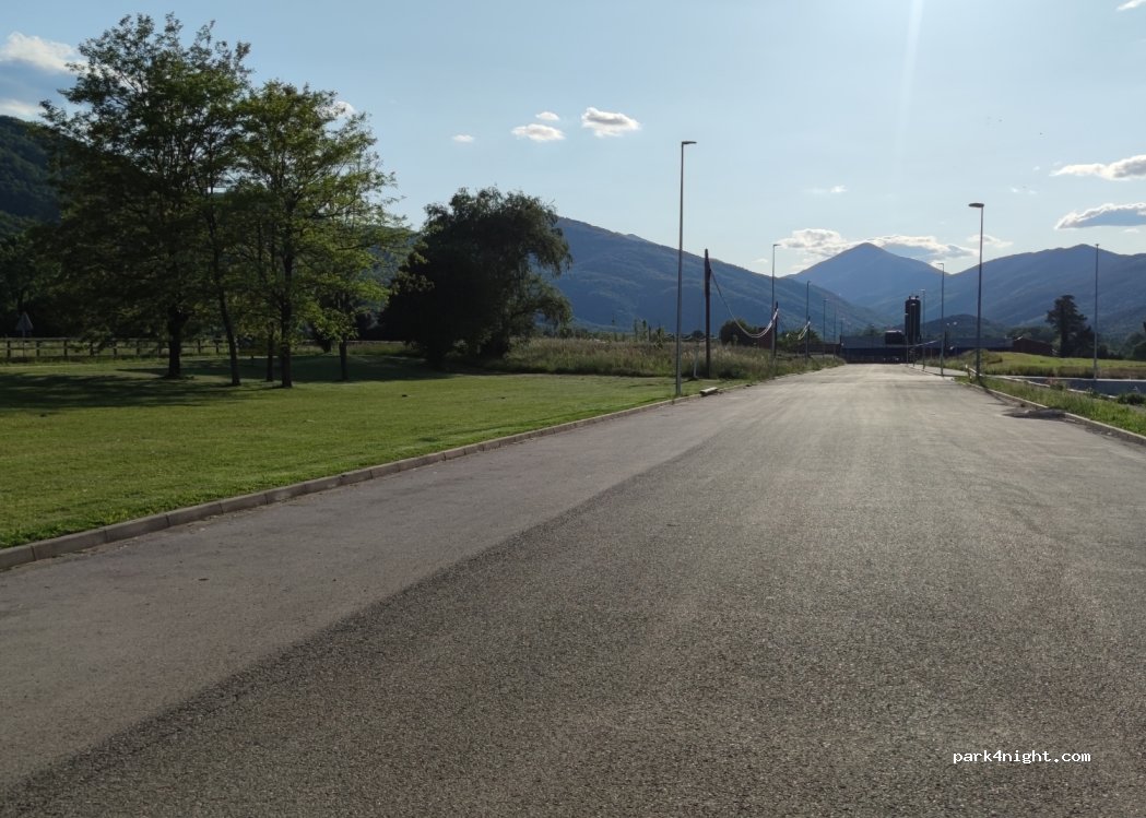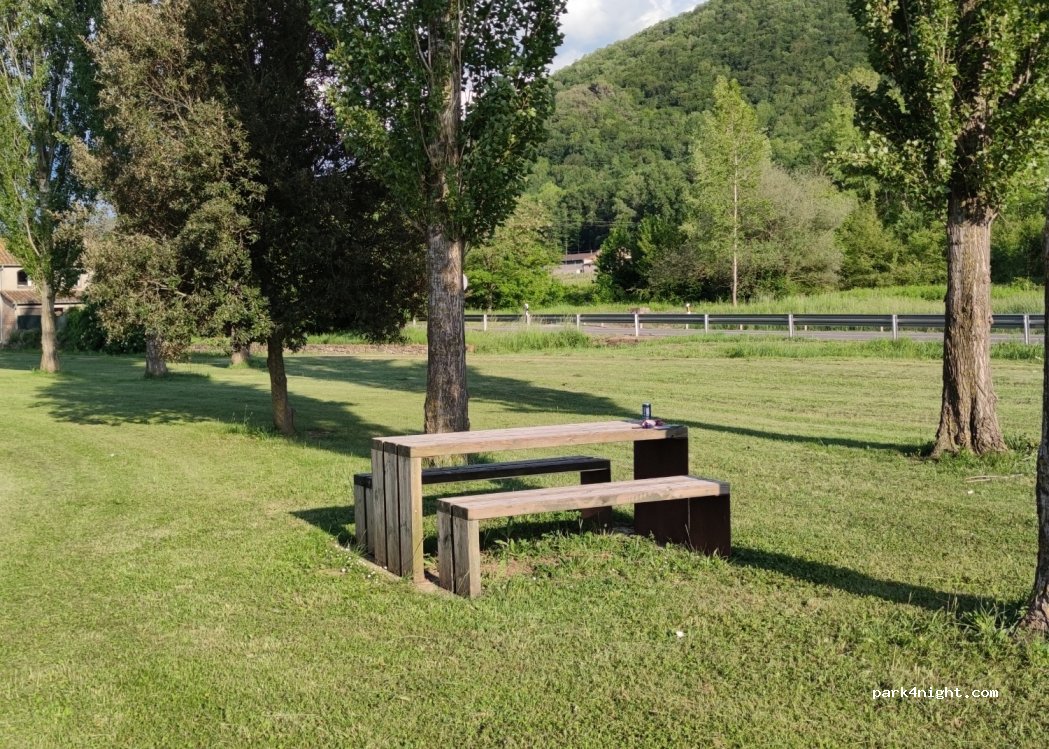 A place parallel to the road with a lot of grass and a table to eat and next to the table we have a fountain where we can replenish water. the place is next to a transport logistics company. with small noises nothing annoying and with the passage of some car or another on the main road but you are away from the road. ideal to spend a night fill water and continue travel. children and the dog will enjoy a lot.