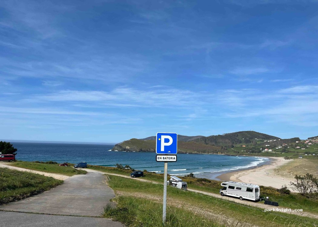 Basic parking area with no services, apart from a bin. However the view over the sea is excellent, as is the beach. A busy spot popular with surfers, quiet. There's a small bar that serves a limited menu close by, very good value. Galicia is camper friendly, unlike some other places. Thank you.