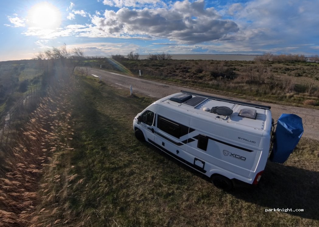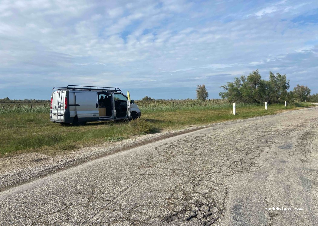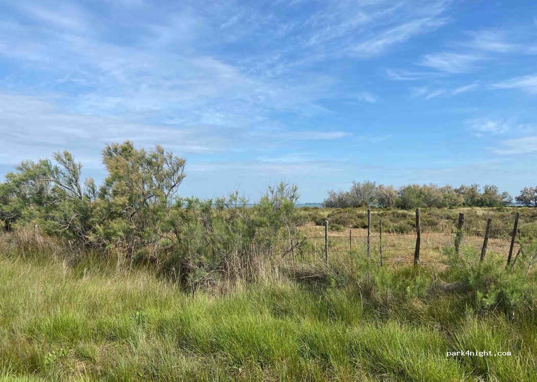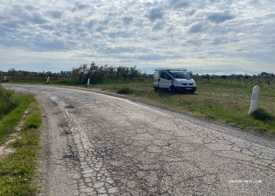 En bordure de la route, un espace d’herbe facilement accessible. Vue sur l’eau et ses flamants roses. Coin tranquille sans bruit la nuit (ni moustique à la mi-mai).