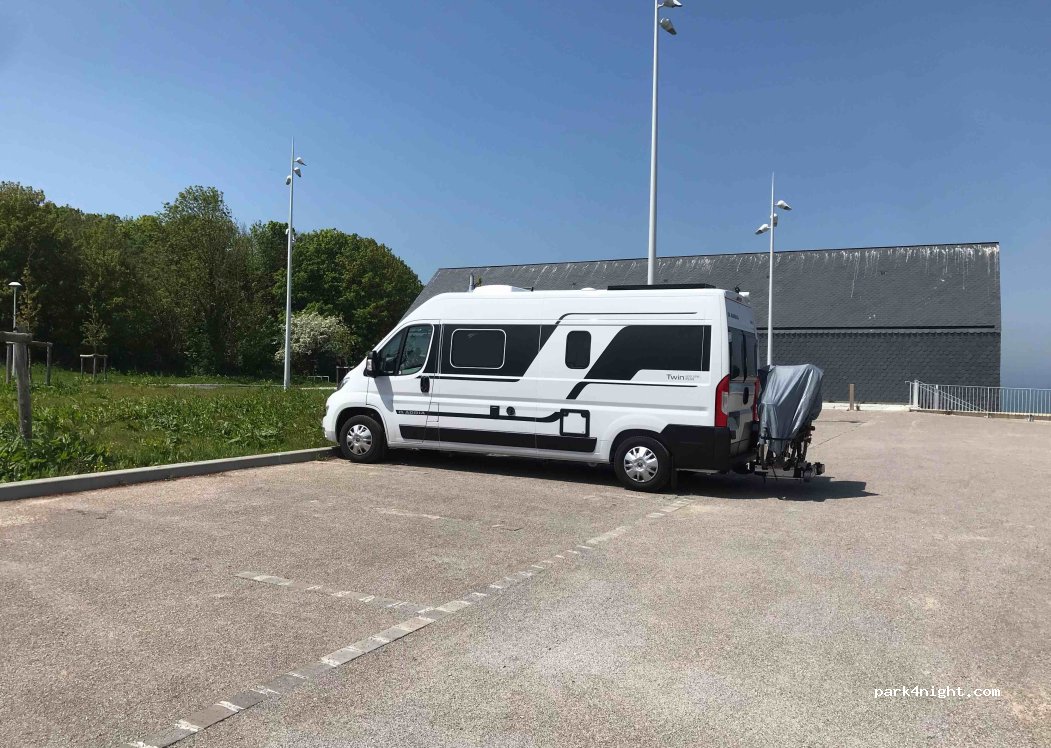 Een nieuwe, grote parkeerplaats op de hoogten van Ault. Het is een verharde ondergrond met een zeer lichte helling. De graskant is toegankelijk voor campers hoger dan 7 m. Ik heb op 6 juli 2024 het gemeentehuis gebeld. De gemeente vertelde me dat we daar konden overnachten. Sinds mei 2025 is de maximaal toegestane hoogte 2,1 m.
