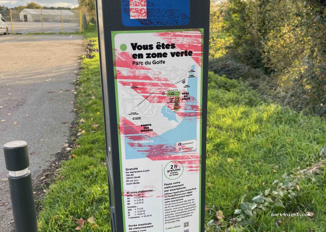 Le parking sur sable et herbe est fermé par une barrière, interdit aux camping cars confirmé par des agents du service technique. Il faut aller sur le parking à côté. Prendre le parking hors gabarit, voir photos . Gratuit de septembre à juin. Jeudi soir, bruit de la discothèque Le Zip tard dans la nuit. Par contre, très bien pour aller visiter Vannes, piste cyclable ou piéton le long du port.