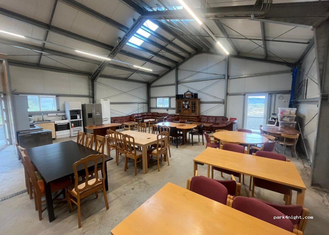 Super well laid out campsite, with flat parking spaces, a huge shed (sofa / table / kitchen / fridge / hob) accessible