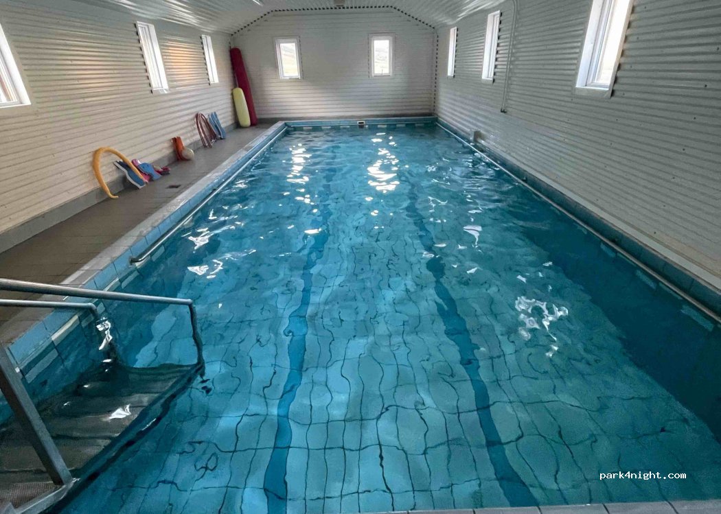 Very nice campground with indoor swimming pool and outdoor hot tub. Indeed pity for the wooden fence around to not view the surrounding area, however as it was very windy it was nice to have some shelter. Kitchen and indoor area were spacious and fridge+freezer were present. Toilets were very small and shower seemed small too, but did not use. Would come again.
