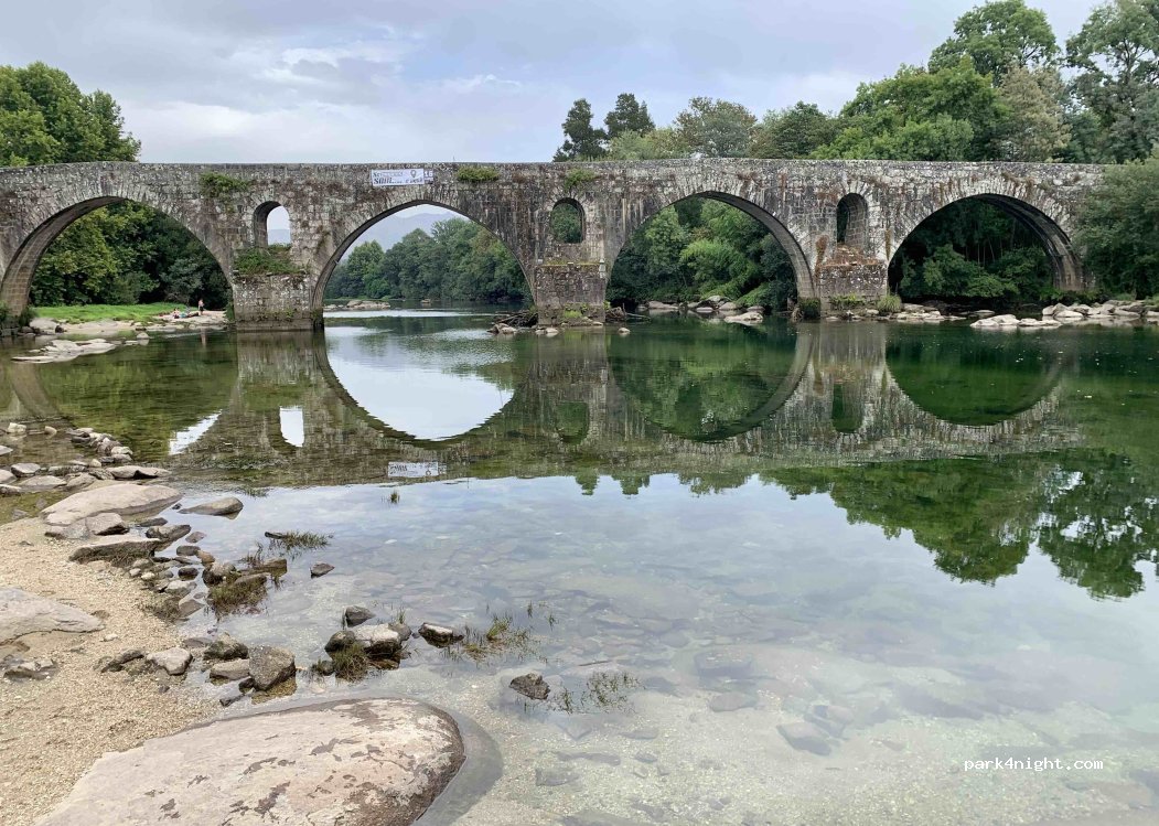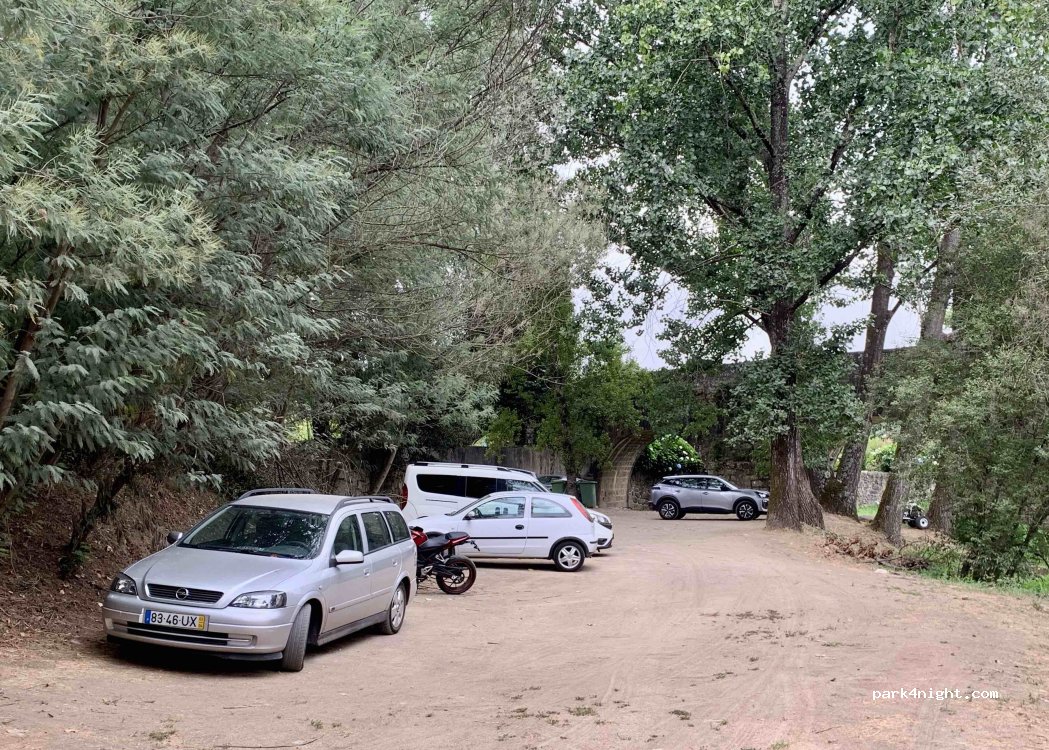 Around right riverside of the medieval bridge named “Ponte do Porto” over the Cávado river. Flat and very beautiful; not illuminated. Access till top of that bridge via “Rua do Rio Cávado” stone street 3 m wide; very convenient for vans; for wider vehicles, stop before turn right to that street, walk 150 m and give a look. A bit noisy due to traffic lane nearby on newer bridge. Round stones good to take a sun bath; river is not deep. Natural pools for children. Experience hiking si old and still good condition bridge!
