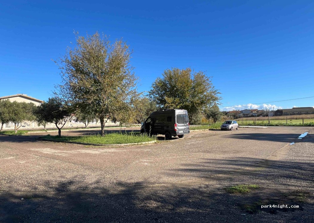 Großer Parkplatz, etwas abseits gelegen, ich war hier allein. Eine Eisenbahnlinie in Sicht- und Hörweite, allerdings gab es nicht allzu viele Züge. Auch Flugzeuge ziehen darüber hinweg. Aber ich habe hier in Frieden übernachtet.