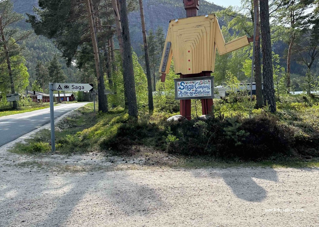 Saga Camping à 3855 Treungen. Espace pour environ 25 à 35 mobil-homes directement sur le lac. Bien situé. Les sanitaires sont plutôt anciens sous terre, mais vous pouvez les utiliser. Mais l'emplacement compense cela. Sentiers de randonnée à proximité immédiate du Skuggenatten, environ 4 kilomètres avec un point de vue. Supermarché Coop et Spar à distance de marche.