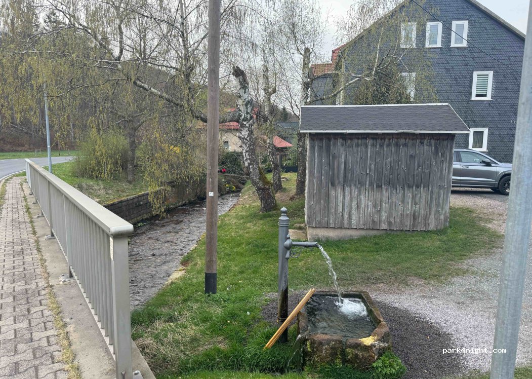 Sehr ruhiger Stellplatz auf einer Waldwiese, direkt an einem Gebirgsbach. Der Stellplatz ist weit genug von der Straße entfernt, so dass der Berufsverkehr, der 6:00 früh beginnt nicht zu hören ist und keinen aus den Schlaf reißt! Die hohen Bäume, die an der "wilden Gera" stehen breiten ihr Blätterdach über den Stellplatz aus! Sie spenden Sauerstoff, Schatten und lassen ein kühles Lüftchen wehen! Er ist 24h offen und bedarf keiner Voranmeldung!