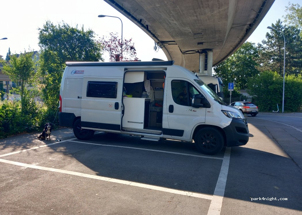 parking mal placé sous une bretelle de route avec beaucoup de bruit de . Il n'est pas fait pour dormir, par compte,avons payé 4,5chf pour 7h00 de parking via l'application et avons pris le tramway n°4 à la station terminale de Tiefenbrunnen, qui se trouve à 200m. 4,5chf pour rejoindre la gare centrale Retour facile par meme tramway puis chercher un endroit aux alentours pour dormir.