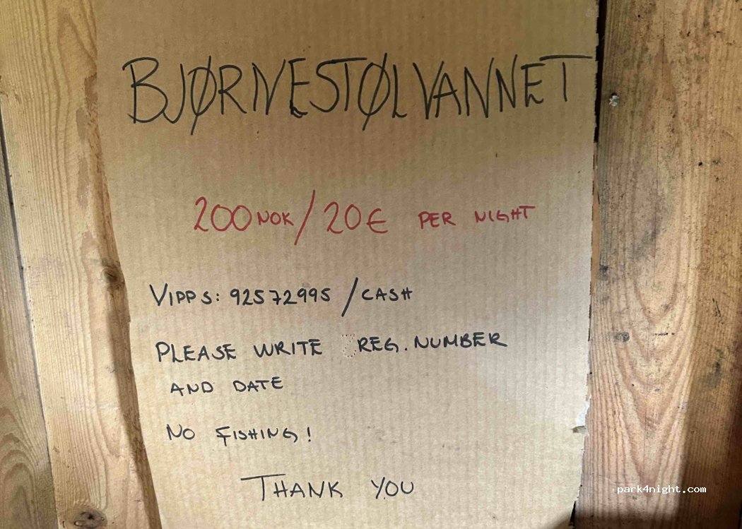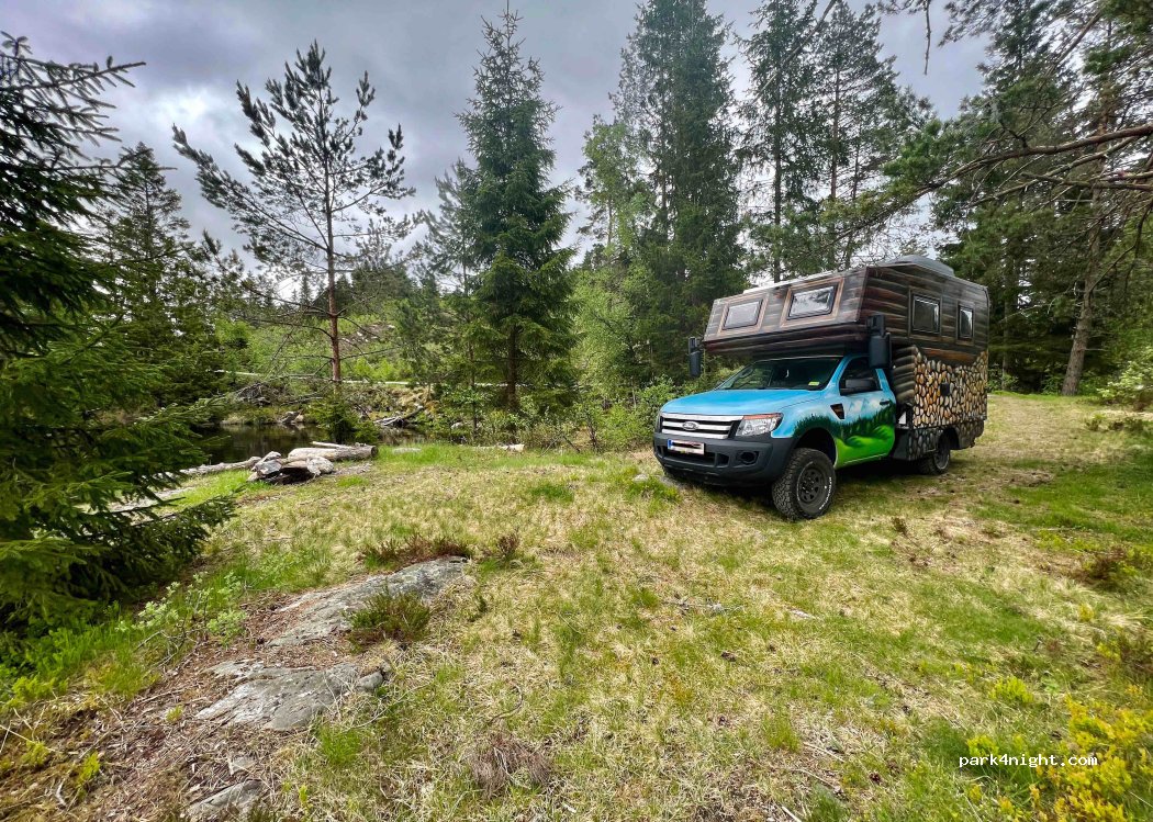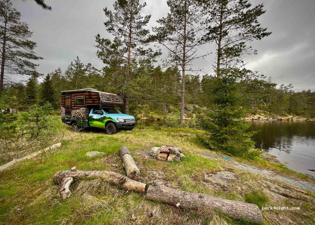 beautiful spot with a private lake. There is room for 3 to 4 vans. price per night is 200 nok or €20. Toilet available.