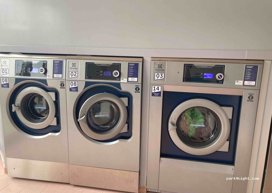 Super! Très propre, 2 machines de 14kg, 2 machines de 8kg, 3 séchoirs. pas besoin de produit (tout est inclus). Payement en cash (5-10-20€) mais rend la monnaie. Il y a bien de la place devant la laverie pour se garer (van 6.5m c'était super facile). On recommande fortement !