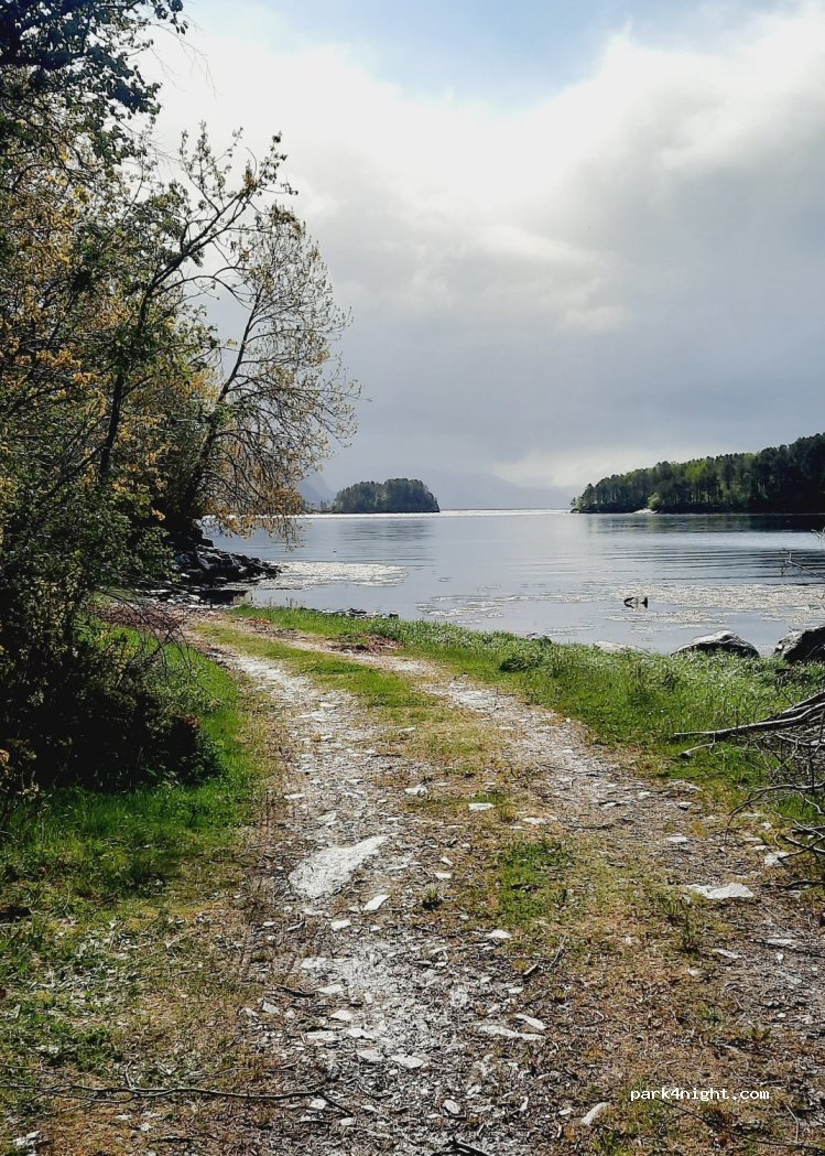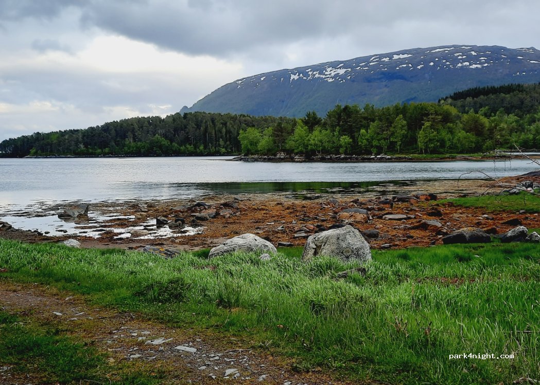 Emplacement pour 1 cc de 6m, situé directement sur une petite baie, à 50 m d'une petite route, qui part à droite, juste avant l'embarquement du ferry de kanestraum.