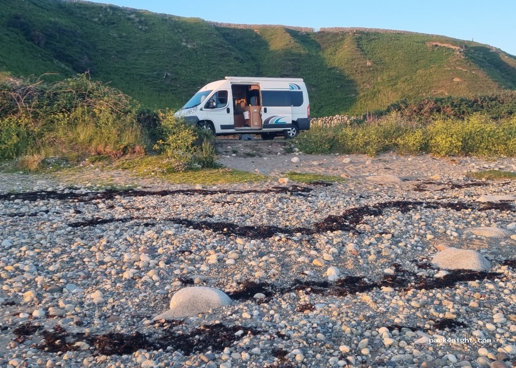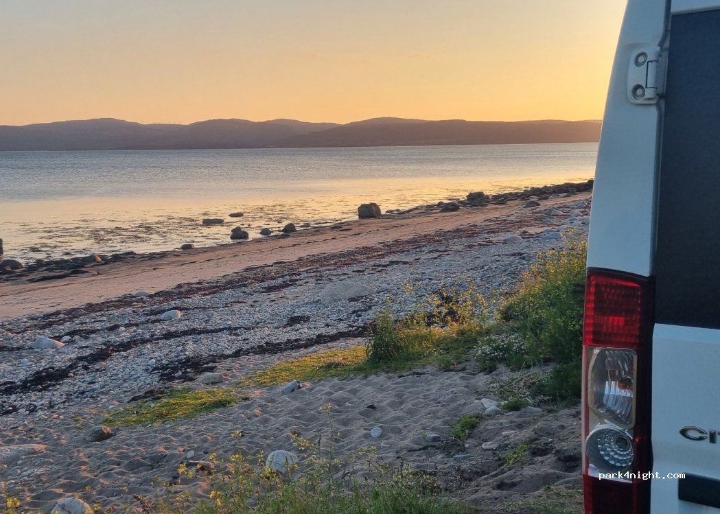 Small grass layby at the side of the road along the beach. No facilities. Quiet road at night. Just 3m from the road but not a problem. Great view across to Kintyre.