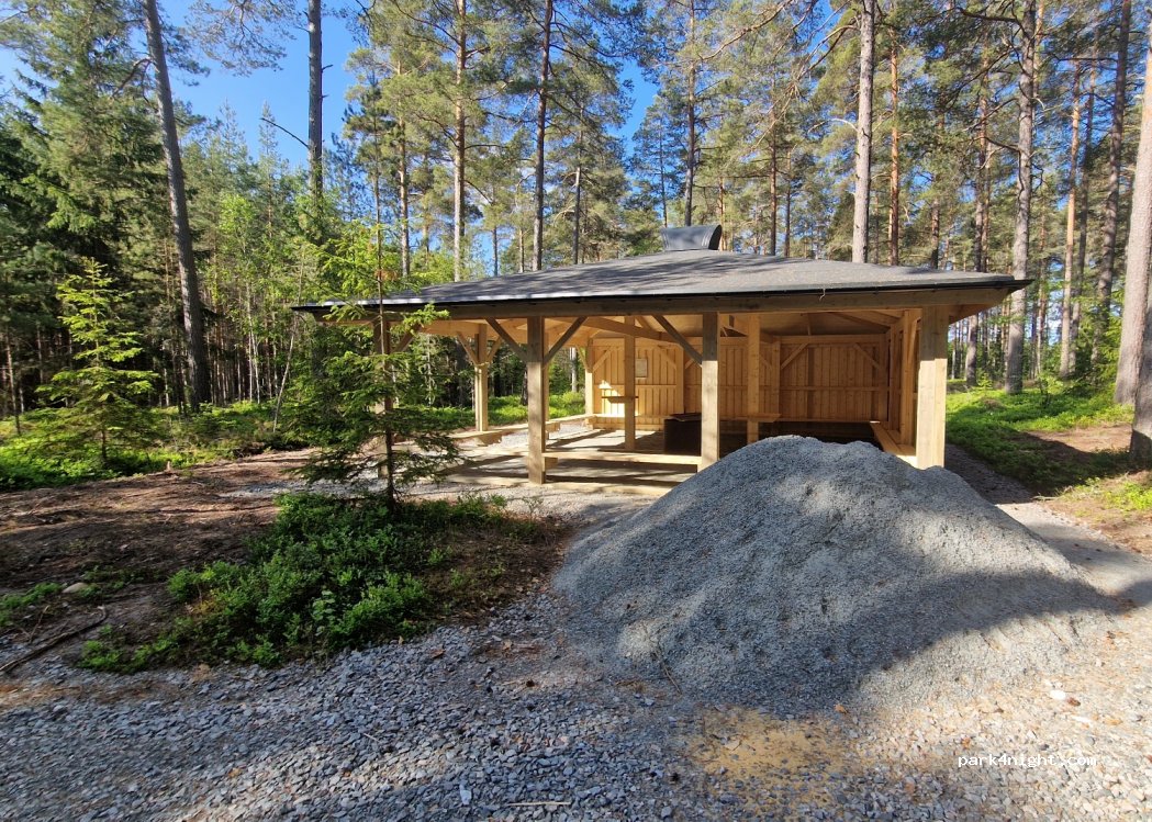 Neuer Park- und Rastplatz mit Grillunterstand. Noch sind keine Schilder vorhanden. Es gibt einen großen Vorplatz zum Parken. Daneben ist ein geräumiger überdachter Grillplatz mit Tischen und einem extra Stellplatz.