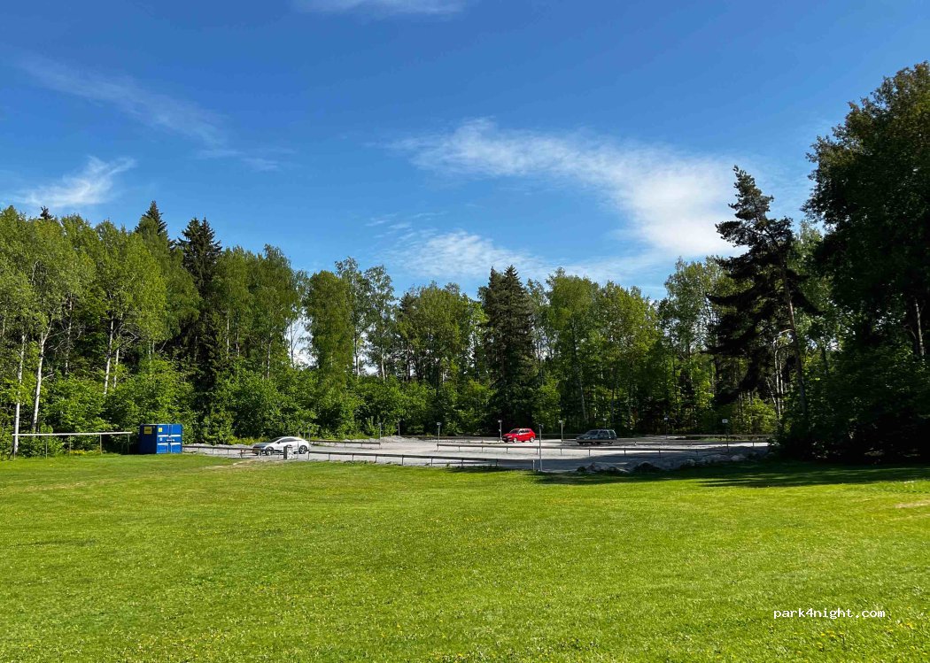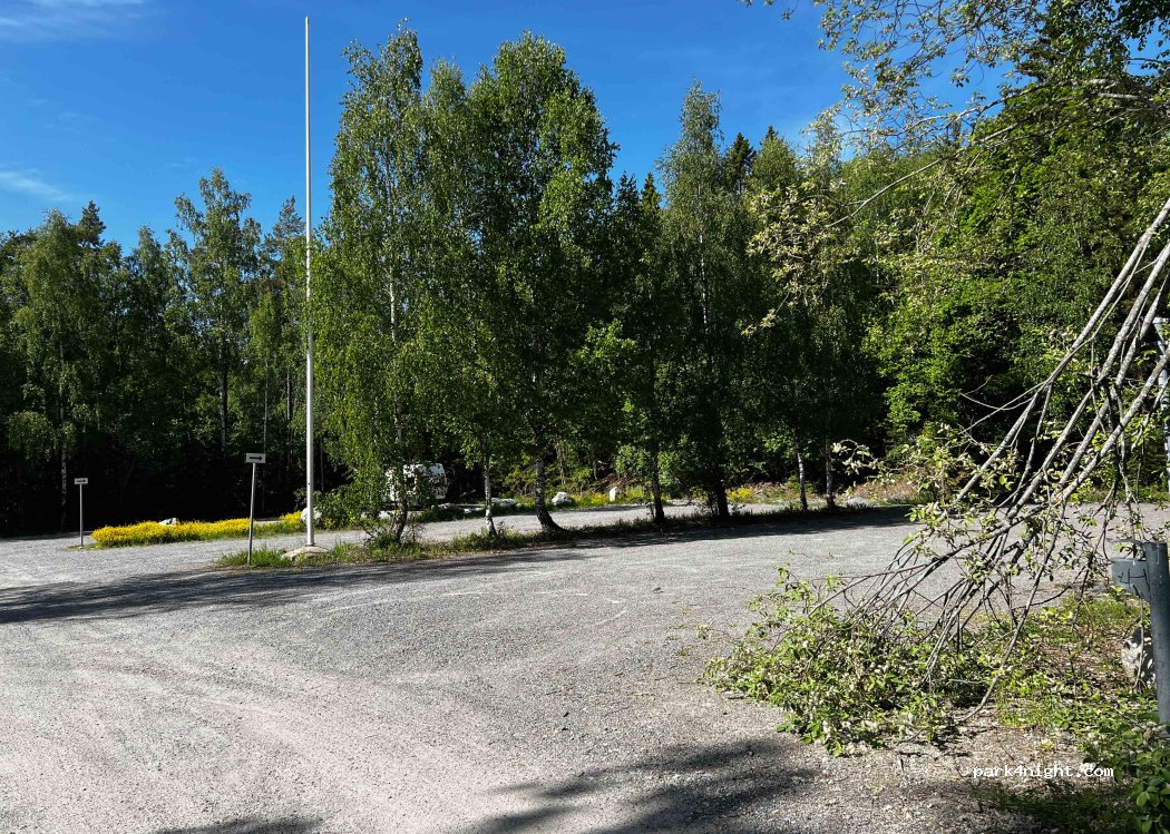 Ängsjö friluftsområde is a popular recreation area. It has three parking spaces, whereas two are big. The one marked is the first and where you a least likely to disturb locals while sleeping overnight. You are surrounded by nature and 450 meters from the lake, toilets, showers, sauna, a small cafeteria and kayak hiring. Please be aware that everywhere north of Stockholm is close to Arlanda airport, so there are always airport noise.