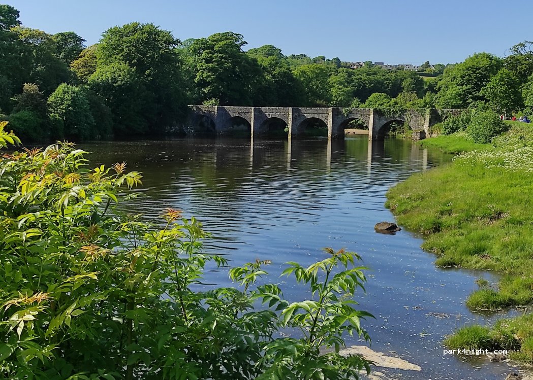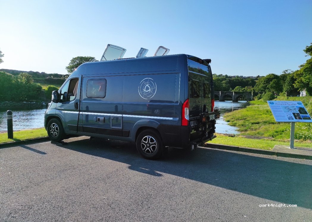 Un petit parking gratuit et bien calme la nuit, très utilisé en journée par les locaux qui vont se balader en famille dans le Swan Park. Il est important de ne pas gêner en ne prenant pas trop de place. Le site est magnifique car au bord de l'eau avec vue sur le vieux pont.On est à 5' du centre ville à pieds. L'aire de service gratuite est à 3' en voiture à côté de l'Office du tourisme.