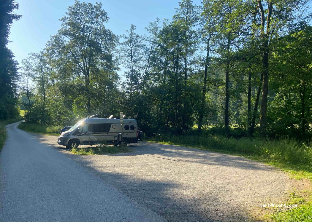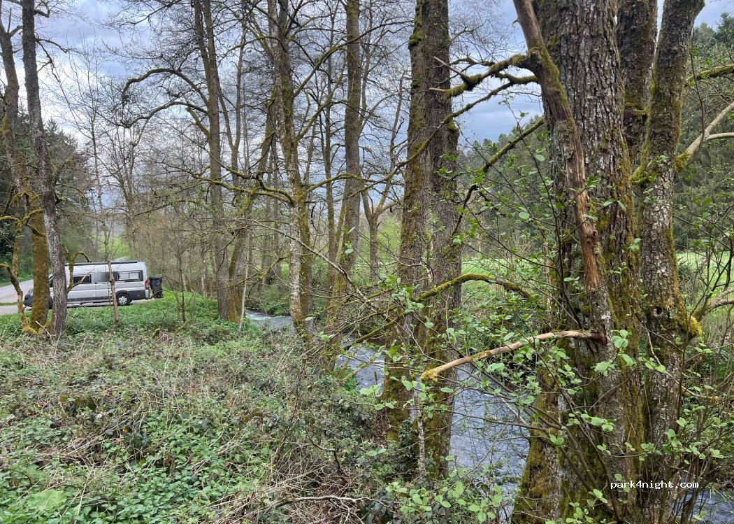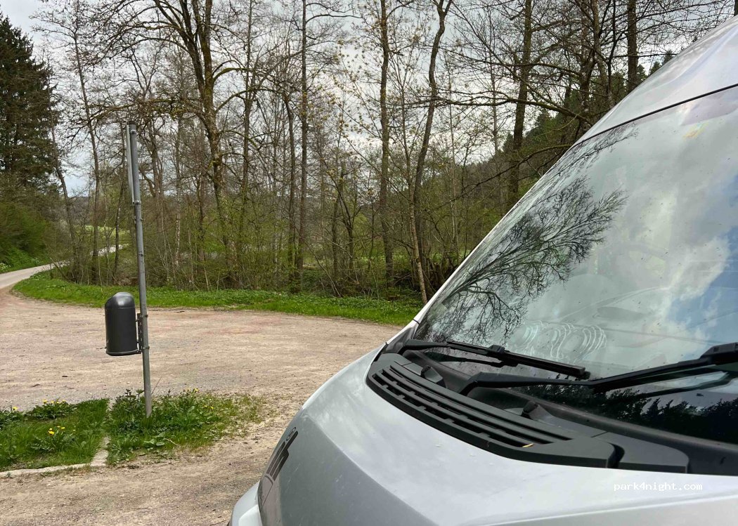 Parking de randonnée hors de la route directement au bord d'un ruisseau. Aucune restriction ni interdiction. Très calme la nuit. Promeneurs de chiens et cyclistes le soir. Taxis des parents le matin (en semaine) vers le jardin d'enfants de la forêt.